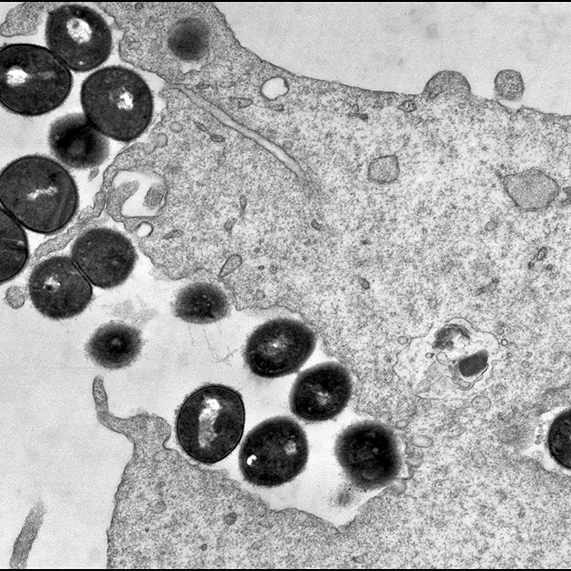Bacteria (dark) bind to and are taken up by a host cell. If bacteria hibernate in the host cell for a prolonged period, they are hidden from the immune system as well as from antibiotic treatment, thus triggering chronic infections. Electron microscopy© Bettina Löffler, Georg Peters