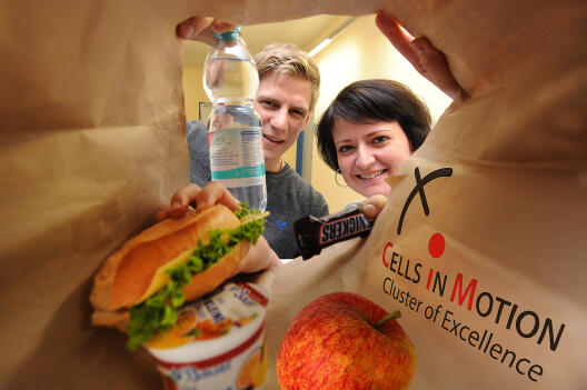 Was aber bringt so viele junge Forscher dazu, zwischen den mitunter langen Schichten in Klinik oder Labor auch noch die Mittagspause einem Fachvortrag und dem Beruf zu opfern? Sebastian Rumpf entgegnet lachend: „Ich sehe das nicht als Opfer, eher als Möglichkeit, sich nett über unsere Arbeit zu unterhalten und ein kostenloses Essen zu bekommen.“ Kostenlos ist der Inhalt der Tüte dank des Geldsegens der Exzellenzinitiative. Im Juni 2012 bewilligte die gemeinsame Vergabe-Kommission von Deutscher Forschungsgemeinschaft (DFG) und Wissenschaftsrat den neuen Exzellenzcluster an der Universität Münster. Seit einem Jahr ist er eingerichtet, etwa 28 Millionen Euro stehen dem Cluster „Cells in Motion“ (CiM) bis 2017 zur Verfügung. Das Ziel: Das Verhalten von Zellen in lebenden Organismen mit Hilfe von hochauflösenden bildgebenden Verfahren zu untersuchen. Von Hautkrankheiten über das Untersuchen der inneren Organe bis zur Degeneration von Gehirnzellen sind Kenntnisse und Bilder von den Prozessen in Zellen wichtig. Die Grundlagen dafür aber kommen aus den unterschiedlichsten Fachbereichen: Biologie, Chemie, Pharmazie, Physik, Mathematik und Informatik. Zum Beispiel können Physiker und Mathematiker dabei helfen, auf tomographischen Bildern Unschärfen herauszurechnen, wenn die Labormäuse sich bewegen beziehungsweise der Patient in der Röhre nicht ganz stillhält.