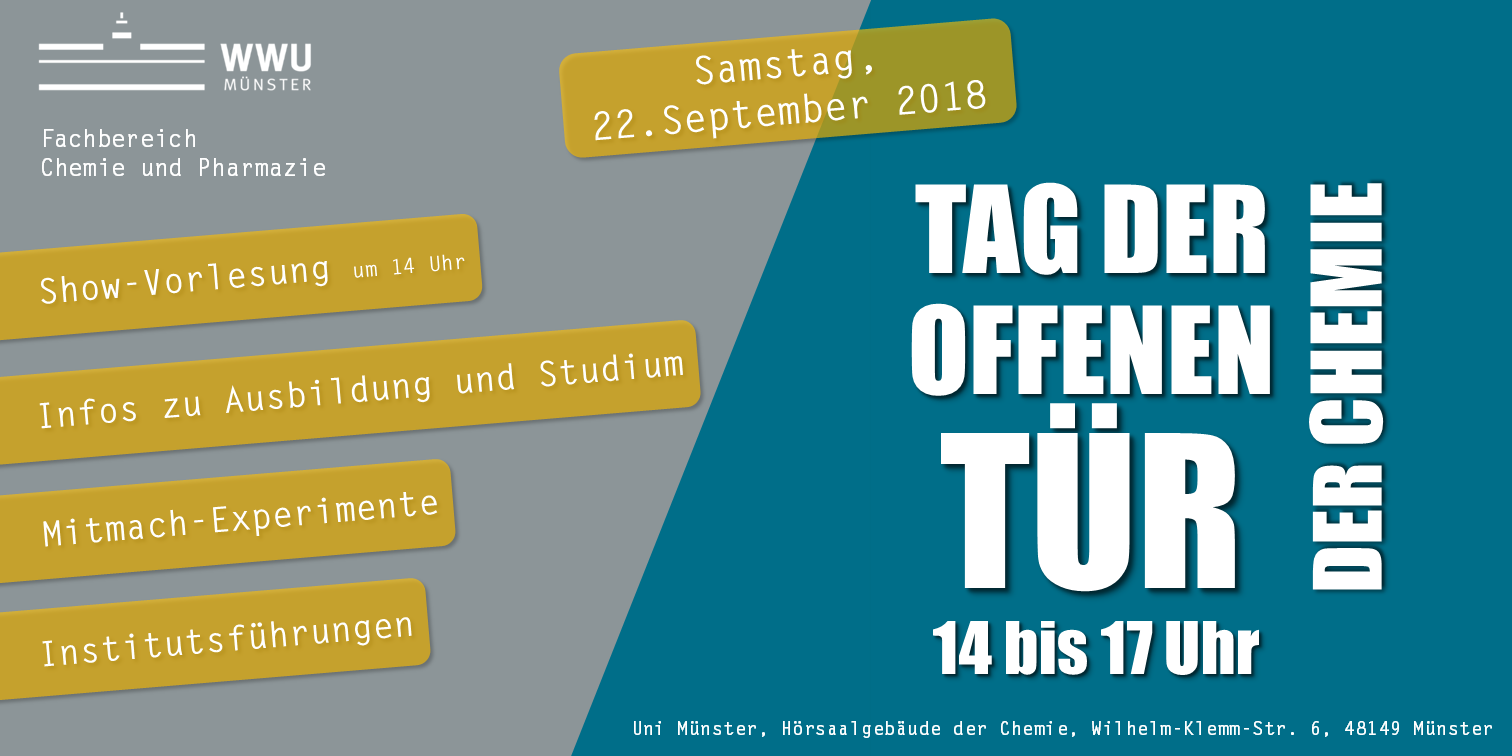 "Chemie steckt überall drin": Das Motto zum Tag der offenen Tür der Chemie konnten die mehr als 300 Besucher am 22. September selbst erfahren. In der Show-Vorlesung "Es werde Licht" führte Prof. Uwe Karst durch die spannende Welt von Licht und Farben: Farbige Flammen, fluoreszierende Flüssigkeiten, starke Laser und viele bunte leuchtende Knicklichter sorgten für große Aha-Effekte. Die anschließende Rallye bot einen bunten Chemieblumenstrauß an abwechslungsreichen Mitmachexperimenten und Vorführungen. Die neugierigen Kinder sammelten für jede absolvierte Station einen Stempel auf ihren Laufzetteln und konnten diese am Ende gegen eine Urkunde eintauschen. Das Resultat waren jede Menge stolze WWU-Chemie-Champions, die von den vielfältigen Experimenten und Eindrücken richtig begeistert waren. Führungen durch drei Institute des Fachbereichs boten einen Blick hinter die Forscherkulissen der Massenspektrometrie, der Zellkultur, der Batterieforschung und starker Magnete, wie sie beispielsweise in NMR-Geräten zum Einsatz kommen. Die AG Junge Lebensmittelchemiker stellte mittels einer alternativen Kühlmethode leckeres Schokoladeneis her, welches von den Besuchern direkt verputzt und für lecker befunden wurde: Ein rundum gelungener Tag.