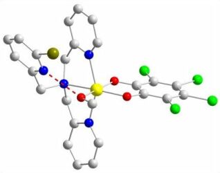 Durch Variationen der verwendeten Liganden können sterische und elektronische Einflüsse auf die Reaktivität der Modellverbindungen untersucht, und Rückschlüsse auf die zugrundeliegenden Reaktionsmechanismen im Enzym gezogen werden. Die Abbildung zeigt einen der untersuchten Komplexe, der als besonderes Merkmal eine intramolekulare Wasserstoffbrückenbindung aufweist.