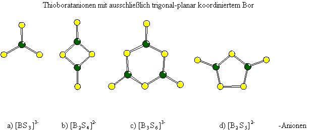 isolierte [BS3]3--Anionen | trigonal-planar | [32,33] [34] [35] [32] [36] [37] [38,39] [40] [34] [34] |
