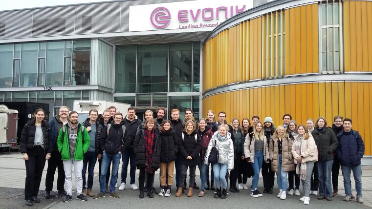 Auf eine Besichtigungstour durch den Chemiepark folgte ein Besuch der Creavis, die sich als spezielles Kompetenzzentrum der Evonik AG auf strategische Forschung und Zukunftsfragen fokussiert. Nach Vorträgen zu Karrierechancen bei Evonik und strategischen Aufgaben sowie Projektarbeiten bei Creavis wurden in einem biotechnologischen Labor die interdisziplinare Entwicklungsarbeit veranschaulicht. Anschließend konnten die Exkursionsteilnehmer in lockeren Diskussionsrunden ihre vielfältigen Fragen mit Mitarbeitern von Evonik bzw. Creavis diskutieren.