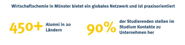 Wir verfügen über ein großes Netzwerk an Wirtschaftschemie-Alumni und Praxispartnern aus der Chemieindustrie und verwandter Branchen wie Pharma und Biotech. Damit du deine Karriere bereits zu Beginn Ihres Wirtschaftschemie-Studiums starten kannst, veranstalten wir in Kooperation mit unseren Praxispartnern regelmäßig Workshops, laden Alumni zu Gastvorlesungen ein und organisieren Campusevents. Dort hast du die Möglichkeit, direkt mit Unternehmen in Kontakt zu kommen und dich über Einstiegsmöglichkeiten zu informieren. Du profitierst darüber hinaus auch vom reichhaltigen Angebot des Career Service der Universität Münster.
