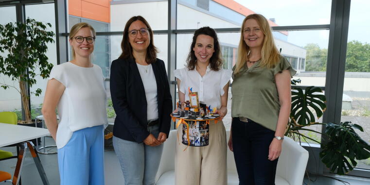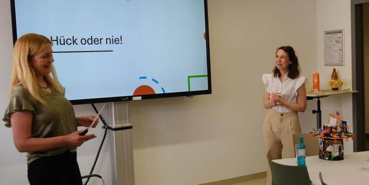 Carolin im Kreis der Prüfer:innen. Die Professorinnen Dr. Nicola Meschede, Dr. Karolina Urton und Dr. Annette Marohn © Institut für Didaktik der ChemieCarolin lauscht dem Vortrag ihrer Doktormutter, der Carolins akademischen Werdegang mit persönlichen Anekdoten und Hits der gemeinsamen Lieblingsband Querbeat nachzeichnet. © Institut für Didaktik der Chemie
