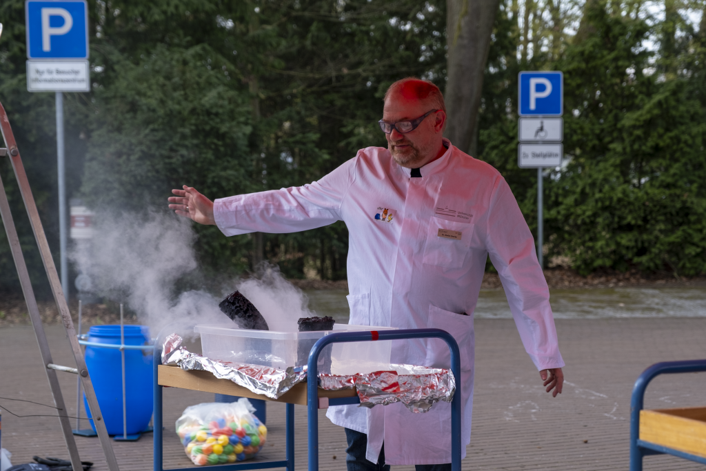 Weitere Experimente wie der brennende Geldschein und Pyropapier begeisterten die Zuschauer. Draußen wurde Papier zum Heulen gebracht und ein Zuckerpilz hergestellt. Zum Abschluss sorgte der Klassiker "Buntes Bällefass" für weitere Überraschungen.