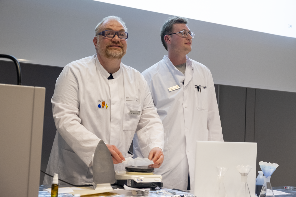 Dr. Stefan Stucky hielt einen interessanten Vortrag über Papier und präsentierte gemeinsam mit Maximilian Fleige Experimente zur Herstellung von phosphoreszierendem Papier, der Imprägnierung von Papier und der Papierchromatographie.