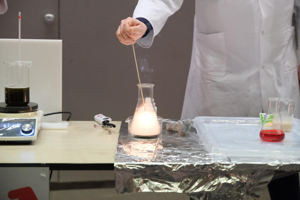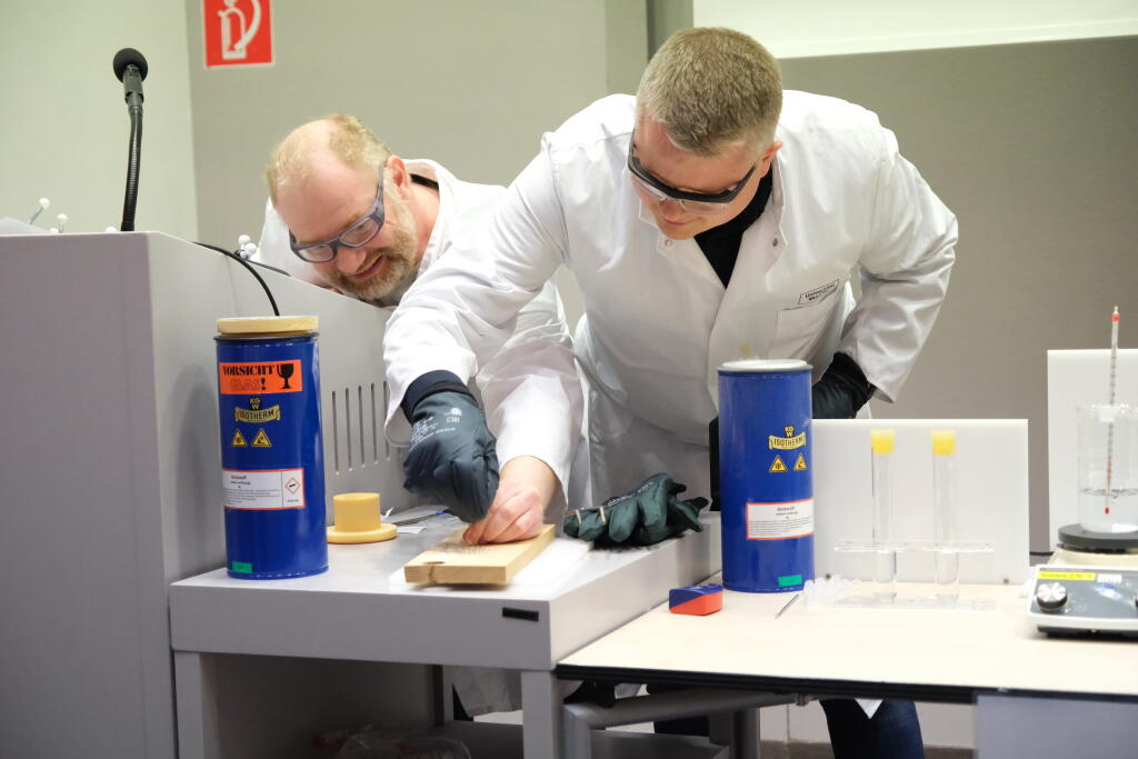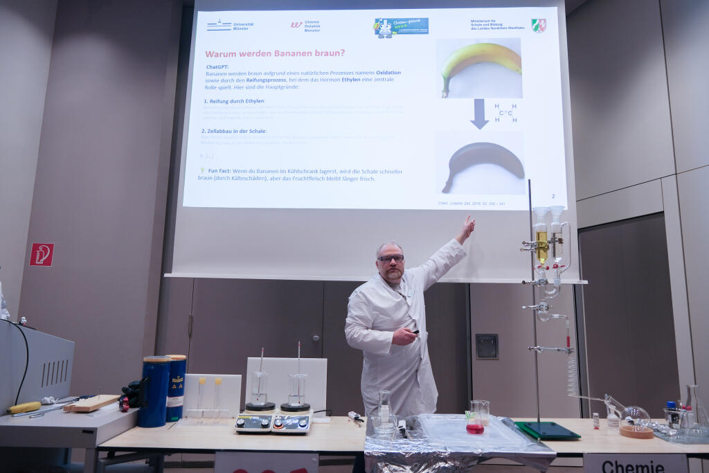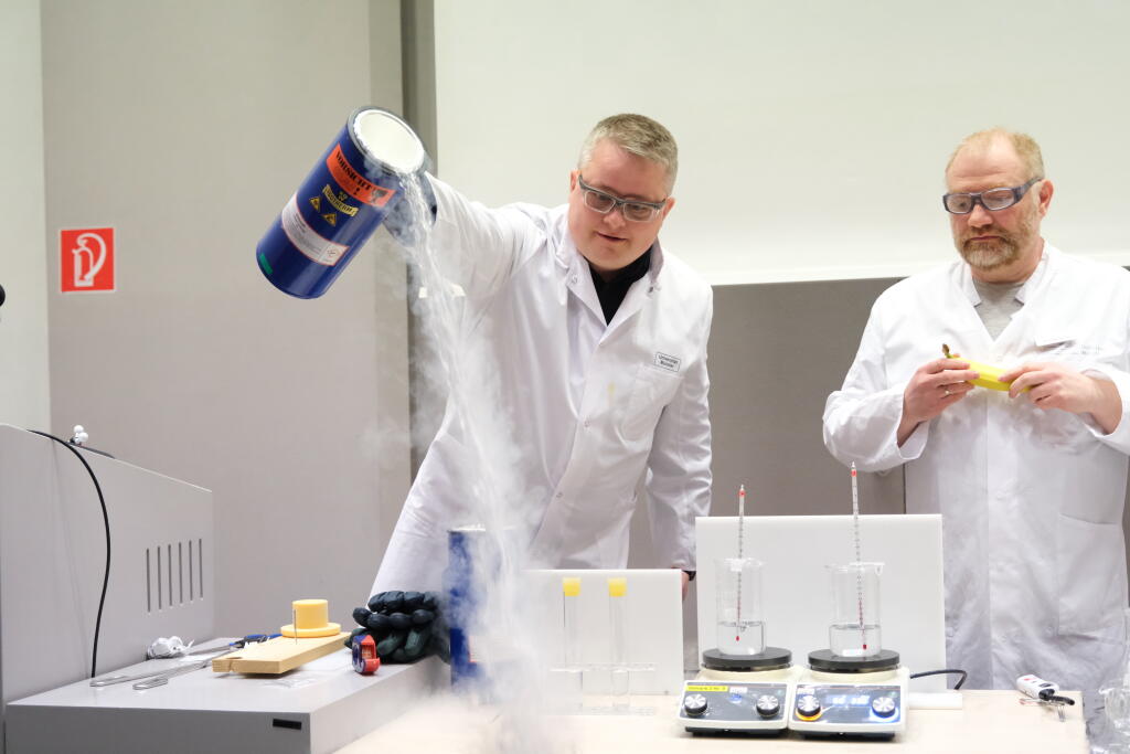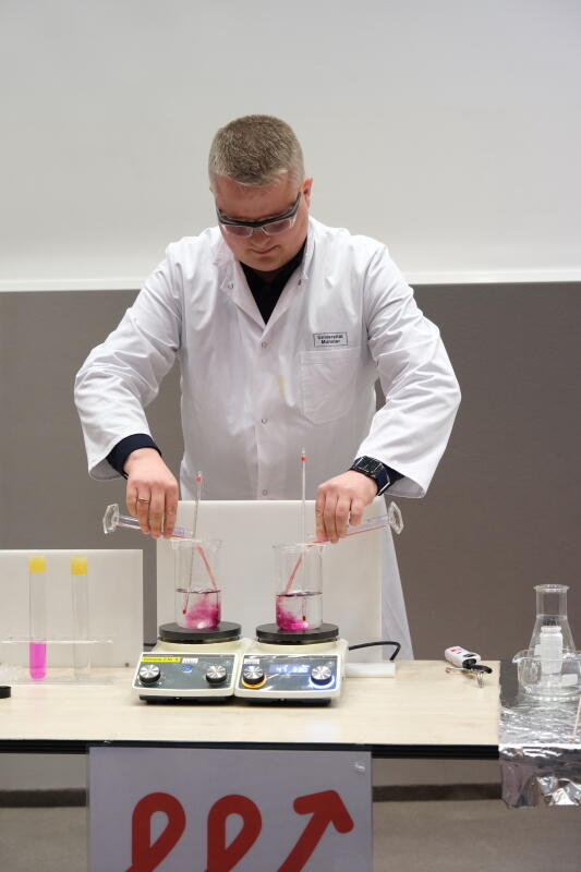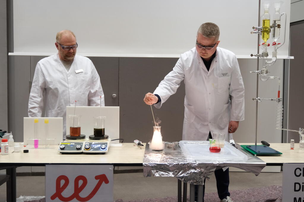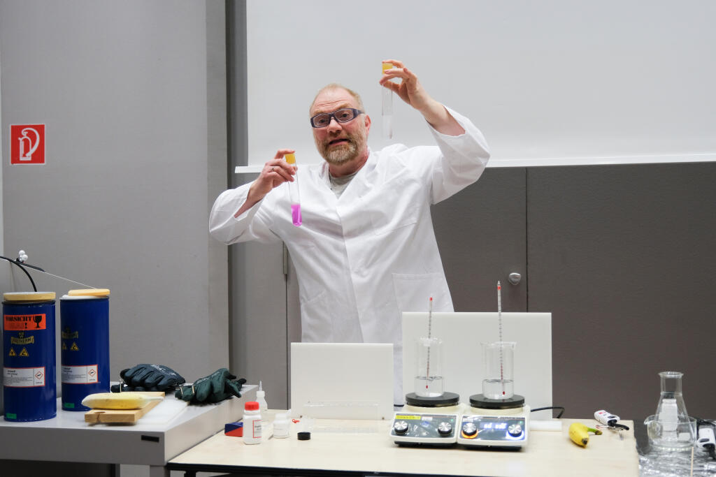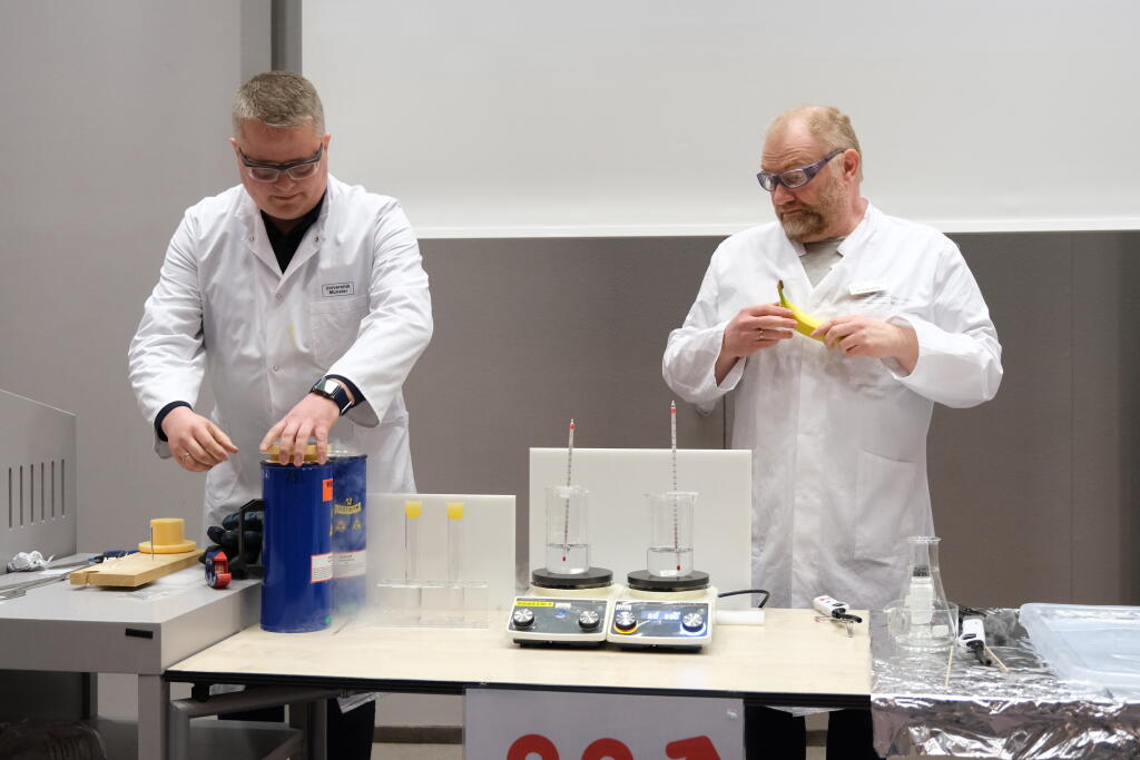 Das diesjährige Thema des Wettbewerbs: "Enzyme". Die Show-Vorlesung von Dr. Stefan Stucky und Dr. Jan-Bernd Haas erklärte zum Anfang auf unterhaltsame Weise den 60 Gewinnern, was Enzyme sind und wieso sich die Banane braun färbt. Das Bananentattoo sowie der Hammerbananenhammer waren nur die ersten Experimente. Anschließend wurde Harnstoff mit Urease zersetzt und gezeigt, welchen Einfluss Schwermetalle wie Kupfer auf Enzyme haben. Außerdem wurde gezeigt wie man Wasserstoffperoxid mit Braunstein (Glimmspan) und Hefe (kleine Elefantenzahnpasta) aufspaltet. Darauf folgten ein Versuch mit Luminol, die Vernichtung von Aluminium und das Knallbonbon. Draußen konnten die Gewinner die Elefantenzahnpasta in groß, knallende Wasserstoffballons und das Bällefass bestaunen.