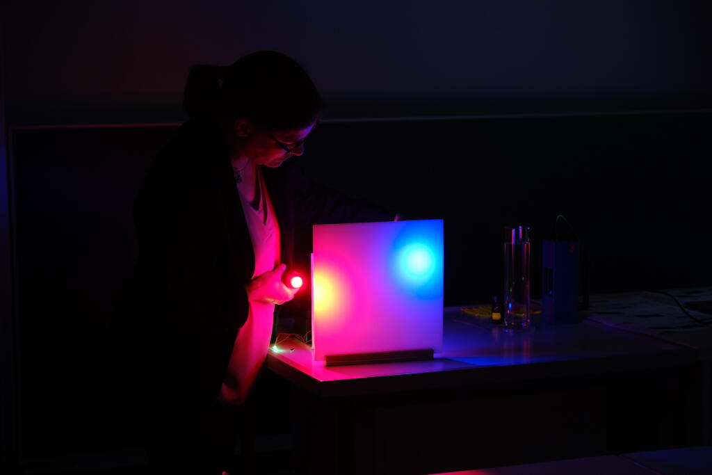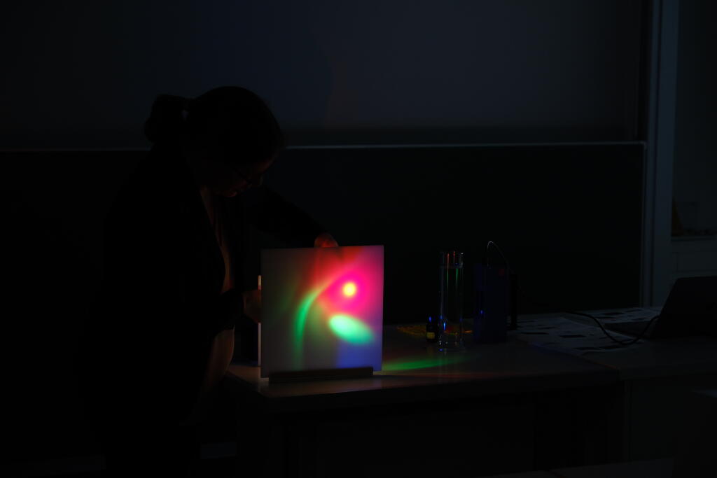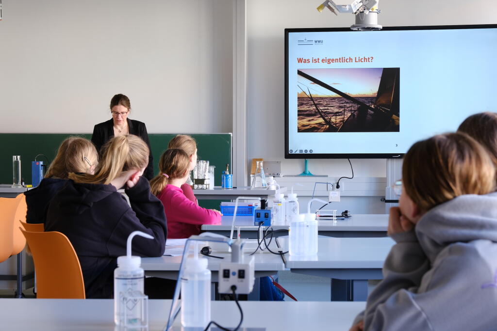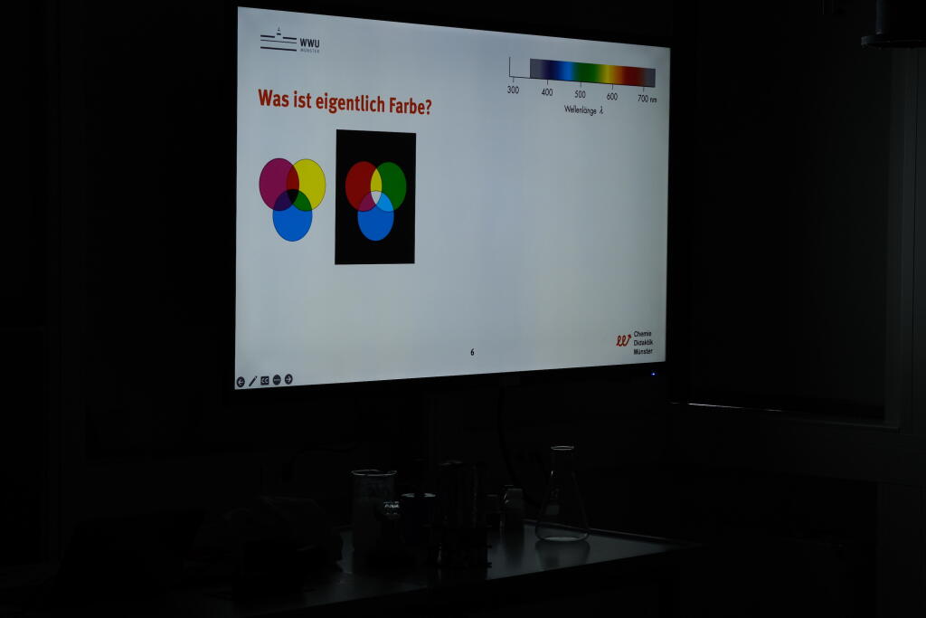 Zu Beginn wurden 13 Schülerinnen von Frau Prof. Dr. Kröger im Institut für Didaktik der Chemie mit einem Experimentalvortrag begrüßt. Nach einer Sicherheitsbelehrung und einer Institutsführung konnten die Schülerinnen anschließend selber nach Herzenslust experimentieren. Es wurden fluoreszierende Stoffe, wie das im Kastanienzweig enthaltenen Esculin oder das im Spinat enthaltenen Chlorophyll vorgestellt. Auch den kriminalistischen Blutnachweis mit Luminol führten die Mädchen durch. Zum Schluss wurden noch Bilder mit Strontiumaluminat gemalt, welches phosphorisierende Eigenschaften aufweist.