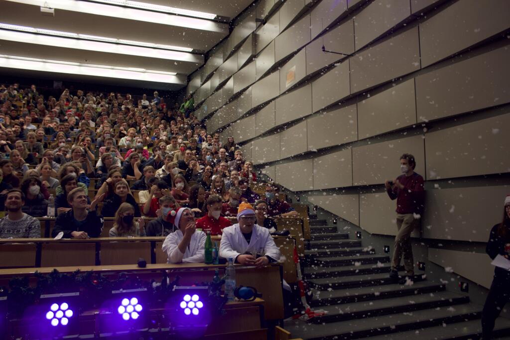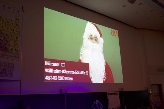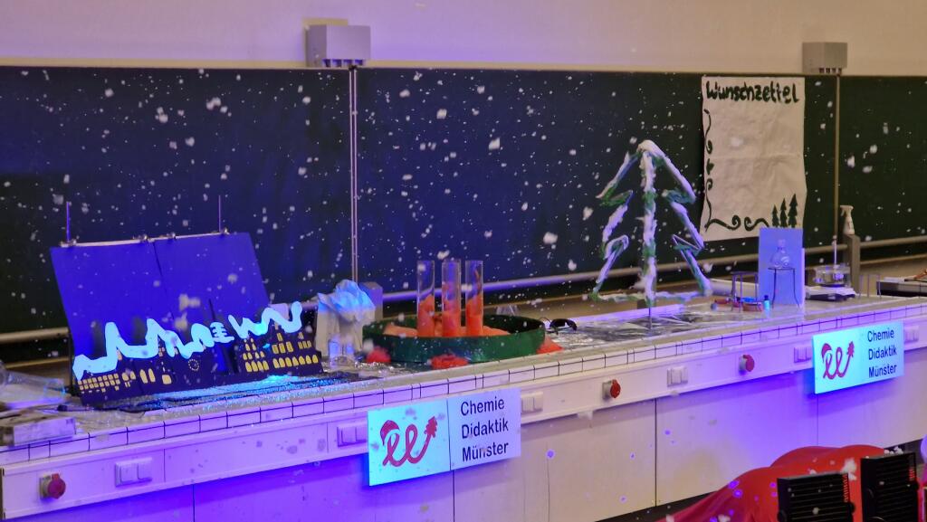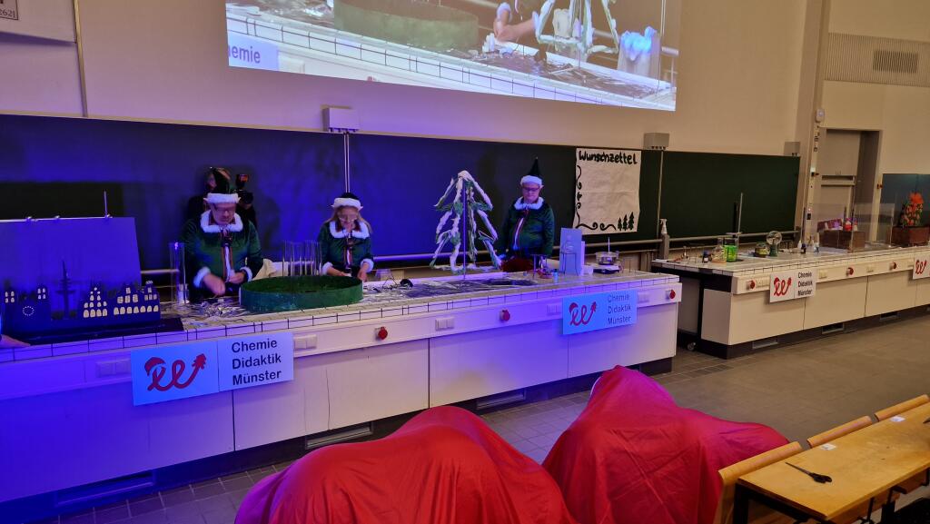 Im Christmas-Institut herrschte emsige Geschäftigkeit. Geschenke mussten verpackt, das Design für die Schneeflocken festgelegt werden, dazu noch das Anbringen des Weihnachtsschmucks und natürlich die Prüfung der Wunschzettel. Nur die Weihnachtswichtel Merry (Prof. Dr. Anette Marohn), Chris (Dr. Stefan Stucky) und Günther (Dr. Jan-Bernd Haas) kamen noch nicht richtig in Fahrt. Das änderte sich schlagartig, als der Weihnachtsmann ihnen eine lange Aufgabenliste mit den Dingen überreichte, die unbedingt vor Weihnachten noch erledigt werden mussten. Angefangen vom Verbreiten der Weihnachtsstimmung in Münster, über die Herstellung von Christbaumkugeln bis zur Entwicklung von feuerfestem Geschenkpapier und zum unfallfreien Verteilen der Geschenke gab es in den letzten Tagen vor Weihnachten noch viel zu tun.