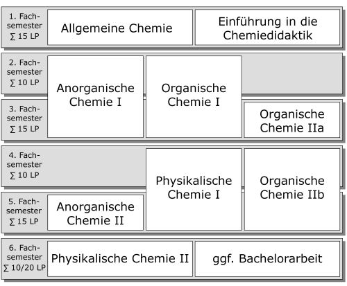 Beide Studiengänge ermöglichen das Studium von zwei gleichwertigen Fächern in Verbindung mit Veranstaltungen im Bereich der Erziehungswissenschaften, das nach einem anschließenden Masterstudium zur Qualifikation für das Lehramt an der gewählten Schulform führt. Der Teilstudiengang Chemie ist in beiden Studiengängen identisch und legt den Schwerpunkt auf die fachwissenschaftliche Ausbildung der Studierenden. Dazu werden in den klassischen Disziplinen (Anorganische Chemie, Organische Chemie und Physikalische Chemie) jeweils Grundlagen- und Fortgeschrittenenmodule absolviert. Hinzu kommt ein Modul zu den didaktischen Grundlagen der Chemie, das die Basis für die weitere fachdidaktische Ausbildung im anschließenden Masterstudiengang darstellt. In den experimentellen Praktika können Unkostenbeiträge erhoben werden, die die Studierenden zu tragen haben. Die Höhe dieses Unkostenbeitrags orientiert sich am entsprechenden Beitrag im Studiengang BSc Chemie.
