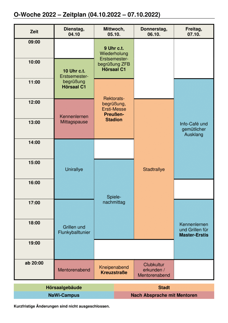 Zu Beginn der O-Woche solltest Du unbedingt die Erstsemesterbegrüßung besuchen. Dort bekommst du erste Informationen über das Studium sowie den konkreten Ablauf der O-Woche.