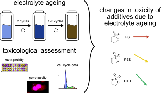 The results of the interdisciplinary research project show a clear influence of electrolyte ageing on the toxicity of the various electrolytes. It became clear that the fresh electrolytes containing 1,3,2-dioxathiolane-2,2-dioxide (DTD) exhibited the lowest genetic toxicity in all models examined, and that this toxicity was further reduced with the age of the Lithium-ion batteries. When 1,3-propanesultone (PS) was used, high toxicity was detected at a consistent level in both fresh and aged electrolytes. Electrolytes containing prop-1-ene-1,3-sultone (PES) showed the highest intrinsic toxicity in some cases, depending on the metabolic activity of the test system used, but also a significant decrease over the course of ageing.
