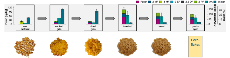 Durch die Analyse von Rohstoffen, Zwischenprodukten und Endprodukten aus industriellen Produktionslinien konnten wir zeigen, wie stark sich die einzelnen Verarbeitungsschritte auswirken und an welchen Stellen Anpassungen der Prozessbedingungen sinnvoll sein können. Die Ergebnisse dieser Untersuchungen wurden nun in der Zeitschrift Food Control mit dem Titel „Formation of furan, alkylfurans and acrylamide during breakfast cereal manufacturing: Comparison of model experiments with industrial processes“ veröffentlicht. Beispielhaft ist hier die Bildung von Furanen und Acrylamid während der Cornflakes-Herstellung gezeigt.