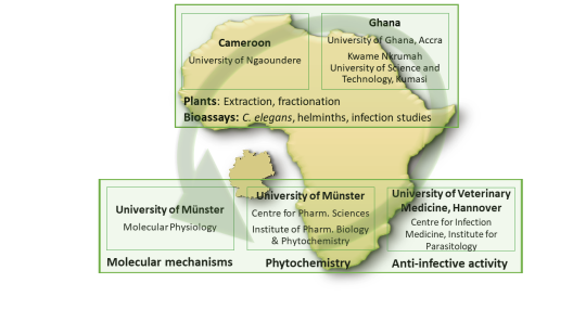 Die Deutsche Forschungsgemeinschaft fördert für drei Jahre ein Deutsch-afrikanisches Kooperationsprojekt im Bereich Infektiologie. Hierbei stehen Untersuchungen zur molekularen Wirkweise von oligomeren Proanthocyanidinen gegen parasitäre Nematoden im Vordergrund. Dass diese Naturstoffe eine relativ stark ausgeprägte nematozide Wirkung gegenüber verschiedenen Nematoden aufweisen, ist aus Voruntersuchungen der Antragsteller bekannt, allerdings ist unklar, welche molekularen und zellulären Angriffspunkte in den Parasiten durch Proanthocyanidine zum Absterben der Würmer führen. In Zusammenarbeit mit dem Institut für Pharmazeutische Biologie und Phytochemie der WWU Münster, dem Institut für Zoophysiologie der WWU Münster, dem Institut für Parasitologie der Tierärztlichen Hochschule Hannover, der University of Ghana in Accra, der Kwame Nkrumah University of Science and Technology in Kumasi (Ghana) und der University of Ngaoundere (Kamerun) werden die geplanten Untersuchungen interdisziplinär durchgeführt. Infektionen mit Würmern stellen auch heute noch in vielen Ländern der Erde ein nicht zu unterschätzendes Problem dar, wobei etwa 1.5 Milliarden Menschen der globalen Bevölkerung als Wurm-infiziert gelten. Forschung in diesem Bereich ist eher unterrepräsentiert, was auch daran deutlich wird, dass von 18 durch die WHO als „vernachlässigte Tropenerkrankungen“ deklarierte Infektionen allein 8 durch Helminthen ausgelöst werden. Forschung zu anthelminthischen Wirkstoffen betrifft nicht nur deren möglichen Einsatz beim Menschen, sondern hat auch einen wichtigen Aspekt innerhalb der Tierproduktion, sowohl in der Dritten Welt als auch in Industrienationen, da Wurmbefall des Nutztieres zum einen die Parasiten in die menschliche Nahrungskette einschleusen kann, zum anderen aber auch die Wirtstierentwicklung dadurch massiv beeinträchtigt werden kann.