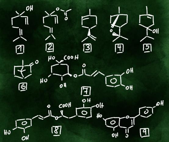 Hauptkomponenten des Öles (vgl. Abb.) sind Linalool (1) und Linalylacetat (2), daneben finden sich weitere Monoterpene wie z.B. Limonen (3), 1,8-Cineol (4), Terpinen-4-ol (5), α-Terpineol und Campher (6). Weitere Inhaltsstoffe von Lavendelblüten sind Chlorogensäure (7), Rosmarinsäure (8) und verschiedene Flavonoide, die von Apigenin (9), Luteolin und Quercetin abgeleitet sind. Die Abwesenheit von Lavandinblüten (Lavandula x intermedia Emeric ex Loisel) wird dünnschichtchromatographisch überprüft.