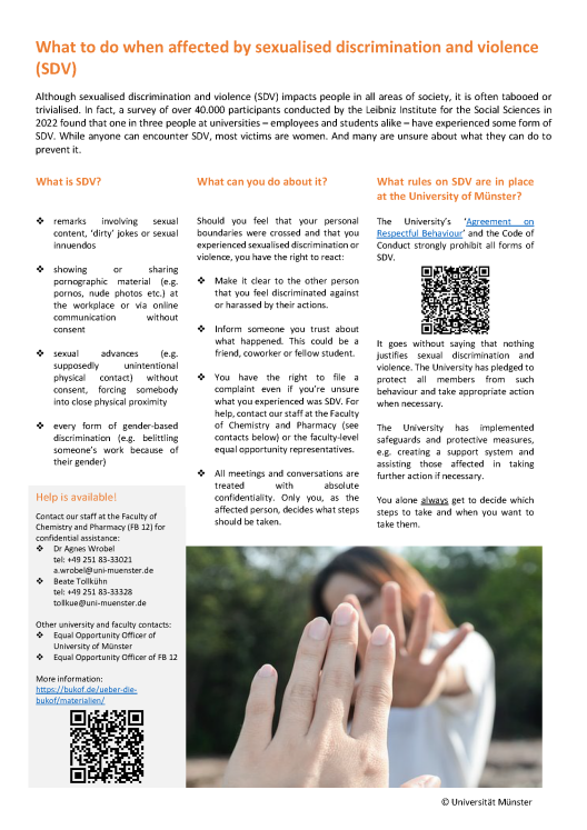 Der Fachbereich Chemie und Pharmazie lehnt jede Art sexualisierter Diskriminierung und Gewalt ab. Dem Thema begegnen wir unter anderem durch die Benennung von Ansprechpersonen. Niedrigschwellige Aufklärungsarbeit leisten wir durch das Plakat Was tun bei sexualisierter Diskriminierung und Gewalt? Download englisch version here.