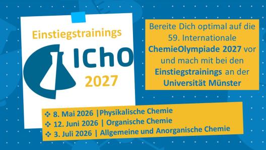 Am 8. Mai starten am Fachbereich Chemie und Pharmazie der Universität Münster die Einstiegstrainings für die IChO 2027, deren Abschlussrunde in Taiwan stattfinden wird. Du bist chemiebegeistert und möchtest bei einem ganz besonderen Wettbewerb teilnehmen? Wir bieten Dir die Möglichkeit Dein Wissen in den Bereichen der Physikalischen Chemie (8. Mai), der Organischen Chemie (12. Junin) sowie der Allgemeinen und Anorganischen Chemie (3. Juli) zu vertiefen. Bei den Einstiegstrainings kannst Du nach spannenden Vorträgen das erlangte Wissen in kniffligen Übungsaufgaben anwenden und festigen und Dich somit optimal auf den Wettbewerb vorbereiten.