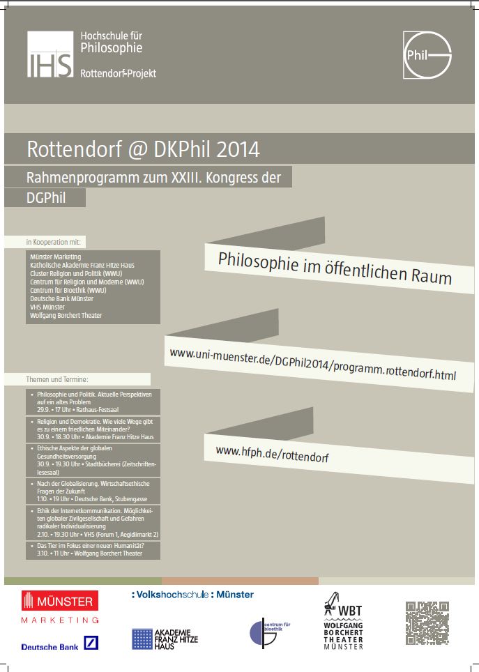 Mit dem 2014 an der Westfälischen Wilhelms-Universität in Münster stattfindenden Kongress der Deutschen Gesellschaft für Philosophie (DGPhil) ist die Möglichkeit gegeben, auch im Münsterland eine Reihe an für die Projektarbeit relevanten Themen öffentlich zu verhandeln. Dies wird in Kooperation einerseits immer mit der DGPhil und andererseits mit für die jeweiligen Themen einschlägigen lokalen Partnern aus Bildung, Kultur und Wirtschaft (s.u.) möglich gemacht.