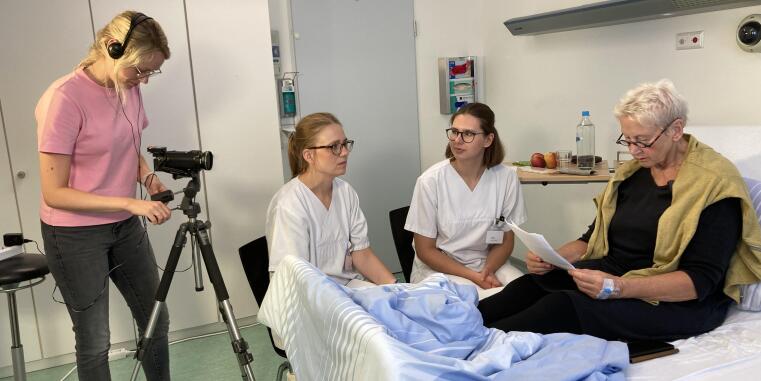 Im Rahmen der Entwicklung des MOOCs stand der erste Videodreh für das LimCare-Team an. Auf der Grundlage der Ergebnisse der Vorstudie konnten erste Fortbildungsbedarfe bei den Praxisanleitenden identifiziert und pflegepädagogisch, didaktisch ausgearbeitete Fortbildungspläne entwickelt werden. Damit die Fortbildungsinhalte adressat:innengerecht gestaltet werden, nutzte das LimCare-Team die Möglichkeiten authentische Videosequenzen im Studienhospital der Universität Münster zu drehen. Hier konnten Szenen aus dem praktischen Alltag von Praxisanleitenden nachgestellt und mit pflegepädagogischen Impulsen komplementiert werden.