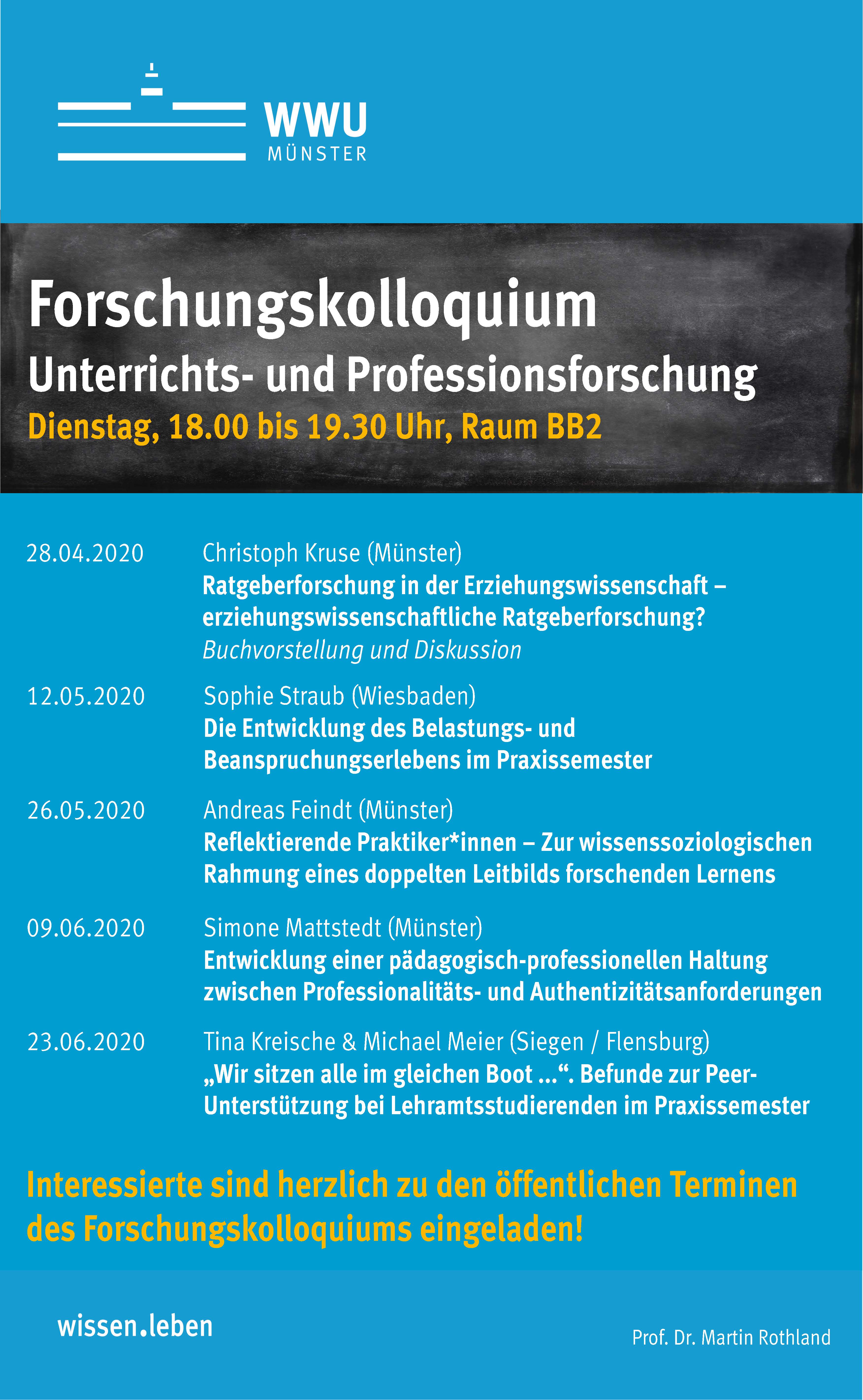 Das Forschungskolloquium Unterrichts- und Professionsforschung von Prof. Dr. Martin Rothland wird im Sommersemester 2020 fortgesetzt.