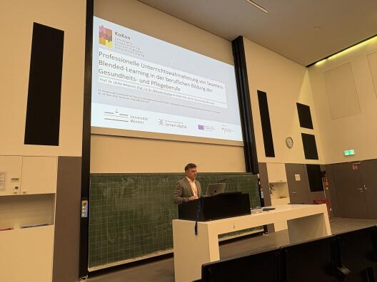 Die AG Berufspädagogik hat sich, unter der Leitung von Prof.'in Dr. Ulrike Weyland und Prof. i.V. Dr. Wilhelm Koschel, mit einem Symposium an der Fachtagung beteiligt. Unter dem Titel „Theoretische Zugänge und empirische Befunde zu Seamless-Blended-Learning in der Fortbildung beruflichen Bildungspersonals im Pflege- und Gesundheitsbereich“ wurden im Rahmen des Symposiums die derzeitigen Forschungsprojekte der AG Berufspädagogik vorgestellt. Prof. i.V. Dr. Wilhelm Koschel eröffnete das Symposium mit einem Vortrag „Zur Bedeutung von Rollenambiguität im Rahmen der Praxisanleitung in der Pflege - Ergebnisse einer Strukturgleichungsmodellierung latenter Konstrukte zur betrieblichen Bildungsarbeit“. Des Weiteren präsentierte Katharina Kettler ausgewählte Ergebnisse ihrer Dissertation vor, in der sie eine Eye-Tracking-Studie zur Erfassung des Cognitive Loads während der Nutzung eines Blended-MOOC bei Praxisanleitenden in der Pflege durchführt. Die Studie gründet sich im Projekt LimCare. Im Anschluss stellte Kristin Klar mit dem Vortrag „Förderung digitalisierungsbezogener Kompetenz zur Ausgestaltung von Seamless-Learning in der beruflichen Bildung am Beispiel der Gesundheitsberufe“ das digitalgestützte Schulungsangebot des Verbundprojekts KoKon vor, welches am Standort der Universität Münster im Teilprojekt 7 „Gesundheit & Pflege“ entwickelt wurde. Als Diskutantin in diesem Symposium konnte Prof.'in Dr. Eveline Wittmann von der Technischen Universität München gewonnen werden.