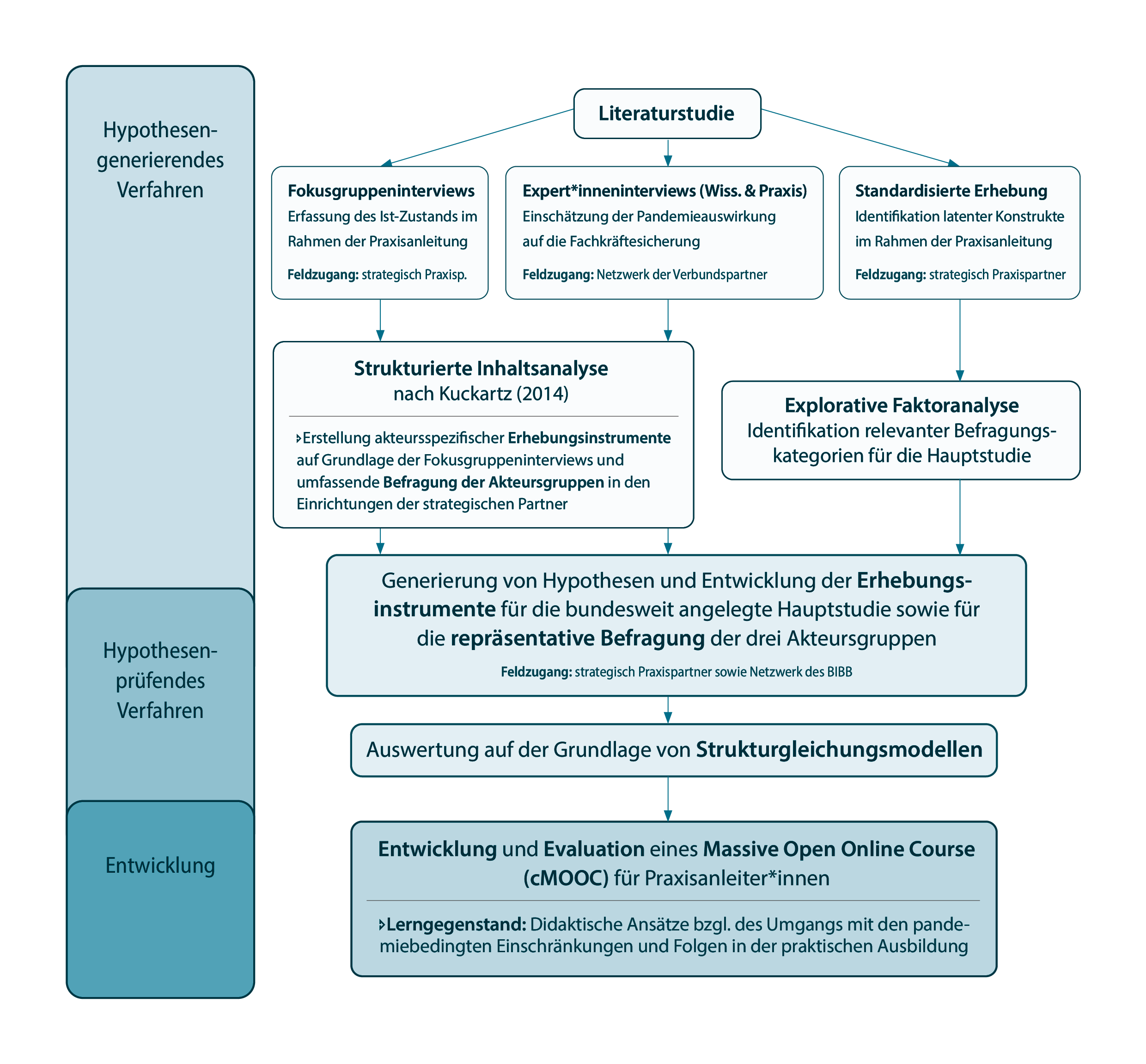 Aufgrund vieler offener Fragen zu diesem Thema startet das Projekt mit einem hypothesengenerierenden Ansatz. Es folgt eine bundesweite Erhebung, in der die entwickelten Hypothesen in einem elaborierten Forschungsansatz geprüft werden. Die Erkenntnisse münden in eine Online-Schulungsreihe sowie in Empfehlungen und Instrumente für die Praxis.