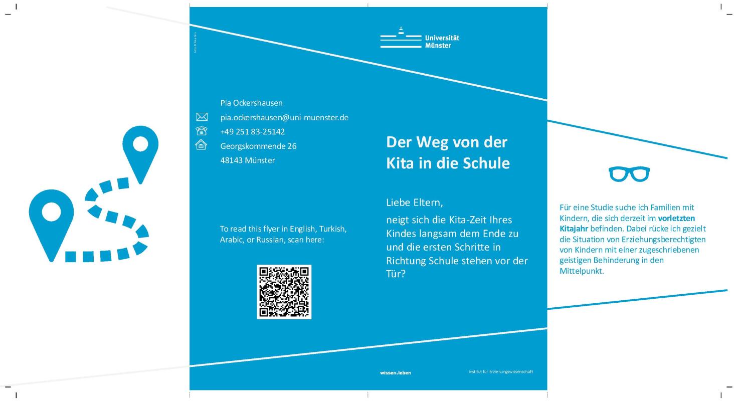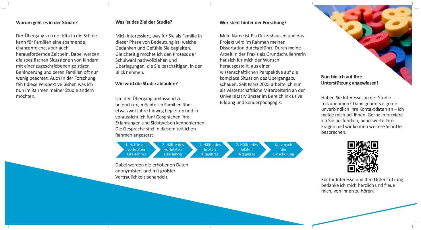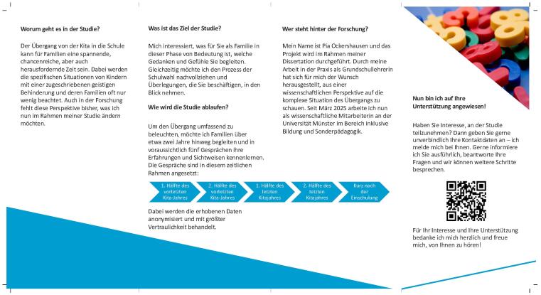 Die Erhebung meiner Dissertation fokussiert den Übergang von der Kita in die Schule für Familien von Kindern mit einer zugeschriebenen geistigen Behinderung. Zentriert werden dabei die spezifischen Situationen der Familien in dieser Phase. Zudem soll der Schulwahlprozess zwischen einer Förderschule und einer Grundschule beleuchtet werden. Um den Übergang in seiner Prozesshaftigkeit zu erfassen, sollen Familien über einen Zeitraum von ca. 2 Jahren wiederholt zu ihren Erfahrungen im (inklusiven) Übergang befragt werden.