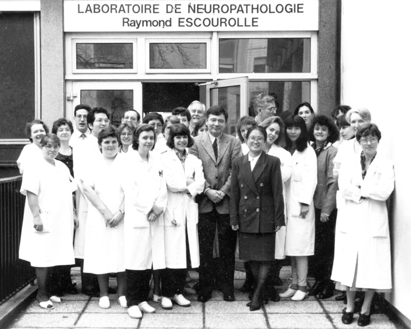I'm going to explain how and why I fell into the Department of Neuropathology at the Pitié-Salpêtrière Hospital of Paris. I'd also like to sketch the history of French neuropathology in the years 1960-2010, as seen by a naive young student, and then by a practicing neuropathologist (often still very naive). As a matter of fact, although the history of neurosciences [1-2] and the Pitié-Salpêtrière Hospital in Paris [3-4] have been the subject of numerous publications, the history of neuropathology in this hospital has been rarely documented [5-6]. I spent more than forty years strolling along the alleys of La Salpêtrière, among its old pavilions, the Saint Louis chapel, the “Pavillon des folles”, the courtyard of Manon Lescaut and the guard room. I worked full-time between the Escourolle laboratory, the “Amphithéâtre des morts” and the University. It has been a real pleasure to be part of this world. I would also like to offer young doctors in training and future neuropathologists some advice that might help them in the choice and development of their future careers. How did I turn to medicine? I was raised by devoted parents, teachers of English and Economics in secondary school and technical education, who had managed to move close to Paris (from Boulogne-Sur-Mer in the north of France, to Dreux, then to Versailles) so that their children could study there. Actually, most of my career followed a succession of accidents. Before I chose my future profession, I hesitated between Sciences Politiques School (humanities and social sciences) and Medicine. As my first stroke of luck, I missed the registration to Sciences Politiques, so I registered to Medicine. In fact, I registered to a pre-training year which included practical work (microscope examination, dissection, etc.). As chance would have it, I was seated next to fellow student Claude-François Degos, whose father was a "Grand Patron" and a Professor of Medicine at Paris University. I heard him talking with one of his friends about his future career: “to access a bright future, one would have to prepare for competitive examinations to become an "extern" [7] and then an "intern" (resident) (paid functions I had never heard of).” The best way to do so would be to follow the “conferences for externship and then those for internship (training courses given by young pedagogical doctors).” That is what I did. It paid. I passed the externship competition. And then, I was lucky enough to be accepted into one of Dr. Jean-Claude Hesse’s internships, one of the best conferences. Thanks to him, I successfully passed the boarding school competition. How did a young student turn to neurology? Every morning except Sunday, “externs” examined selected patients of their department and drew up their files under the supervision of “interns” and other doctors. Each 6-month “externship” was chosen on the basis of the year in which the student passed the competition and his admission rank. I started my externship at the Raymond Poincaré Hospital in Garches, a suburb of Paris (near Versailles, where I lived with my parents), in Doctor Jean Benassy's Neuro-rehabilitation Department. More specifically, it turned out to be a ward for tetraplegic patients. It was an emotional shock and perhaps the origin of my vocation. Another stroke of luck: a year later, when I was ending another externship in medical consultation at Boucicaut Hospital in Paris, Dr. Pierre Thiroloix, who oversaw this sector, kindly asked me: “What specialty would you like to do?” I answered, “Neurology.” He recommended me to Professor Pascal Brunet (Fig 1) at La Salpêtrière Hospital, who proved to be an excellent mentor throughout my whole career. Following his advice, I did one externship in neurology in Professor Paul Castaigne’s and an additional one in Professor François Lhermitte’s department at La Salpêtrière Hospital. I began my residency in internal medicine and then transitioned to neurosurgery (a specialty for which I obviously had no talent!) in Professor Marcel David’s department at La Pitié Hospital [8]. At the same time, I began studying psychology at the Universities of Nanterre and Paris. Figure 1: From left to right: Dean Pascal Brunet, Alex Novikoff, Jeanne-Marie Boutry, Françoise Cathala in her office at La Salpêtrière, and Miss Besse, influential secretary of Dean Paul Castaigne. How did a young student in neurology fall into research (nerve tissue culture)? In the Neurosurgery Department of Professor Marcel David, a neurologist, Dr. Elie Bernard-Weil told me one day (yet another stroke of luck!): “I've invented a treatment that allows damaged nerve tissue to regenerate. I'm looking for someone to study it. Would you like to do it on nerve tissue cultures in a research laboratory: the Service de Physiopathologie Cellulaire (Department of Cellular Physiopathology) of Saint-Antoine hospital in Paris?” Of course! It was a turning point. In Doctor Roger Robineaux's laboratory (part of the new research association “Association Claude Bernard pour la Recherche Médicale”), I was given an exceptionally warm welcome by all the members of the teams, including a researcher from the Centre National de la Recherche Scientifique (CNRS), Pierre Goube de Laforest. I learned from them a wide range of tissue culture techniques (of cells: "histiotypic", of organs with migration of certain cells around the explant: "organized", of organs without this cell migration: "organotypic", now called "organoids”) and first applied them to nerve tissue from chicken embryos (one of the least expensive to obtain). I also learned how to study them "in vitro" by phase contrast (or Nomarski) differential interference contrast (DIC) and microcinema or by light and electron microscopy [9]. This made it possible to study both nerve growth factors and the toxicity of certain molecules (e.g., lipidosis induced by some drugs) [10]. I used 