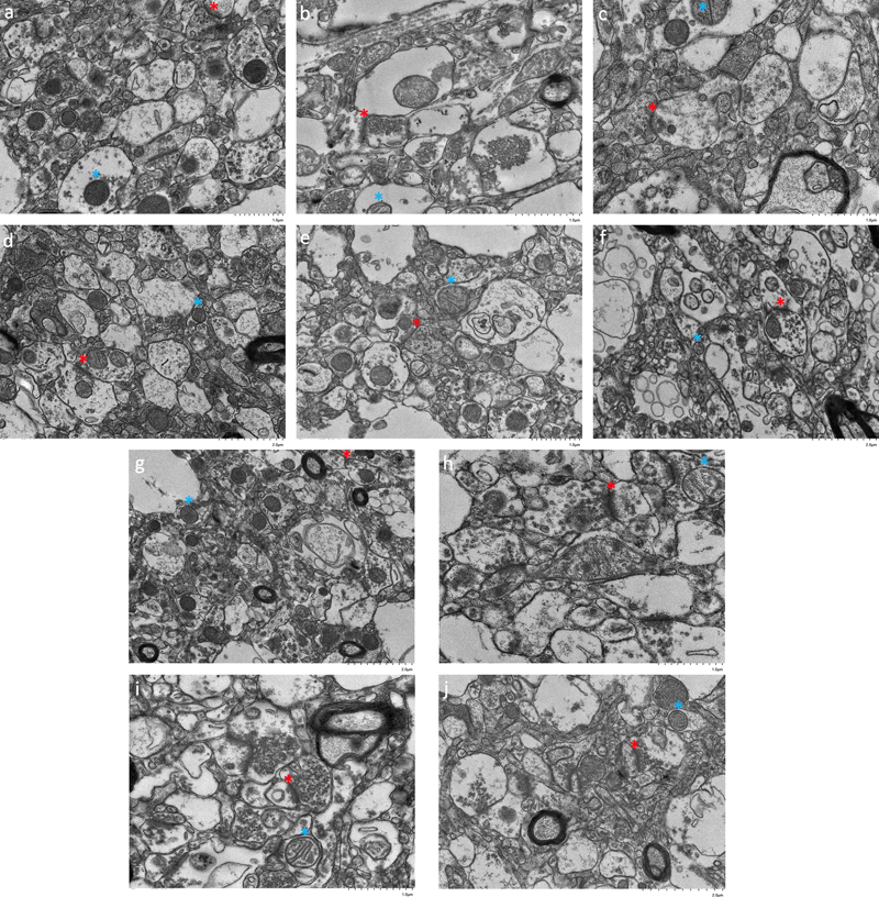 Figure 4. Representative TEM images show qualitative preservation of synapses and mitochondria. All tissues are from the frontal cortex. Asterisks indicate two representative structures: synapses (red) and mitochondria (blue). Donor numbers: 36 (a), 40 (b), 57 (c), 98 (d), 100 (e), 113 (f), 198 (g). 233 (h), 265 (i), 267 (j). Scale bars: a-c, e, h, i: 1 μm; d, f, g, j: 2 μm. Quantitative analysis of the TEM images revealed several findings. Varying degrees of myelin disbanding were seen across samples, a phenomenon known to occur early in the PMI (Krassner et al., 2023). Myelin disbanding was found to be present in 81 % (87/107) of the largest myelinated axons seen in each high-resolution image. The degree of myelin disbanding ranged from 0.0 % to 71.5 % across samples. Note that some degree of myelin disbanding can be present even in EM images from human surgical biopsy specimens that are preserved via immersion fixation (Shapson-Coe et al., 2024). The density of myelinated axons varied across images, ranging from 0 % to 21.5 %, with an average density of 4.2 %. The highest number of myelinated axons identified in one image was eleven. Notably, in the ten brain donors, there was no significant rank correlation between the myelin disbanding percentage or the myelinated axon density and the PMI (myelin disbanding percentage: ρ = 0.21, p = 0.56; myelinated axon density: ρ = 0.006, p = 1.00; Figure 5). These results suggest that while postmortem changes are evident, substantial structural integrity is maintained in many myelinated axons.