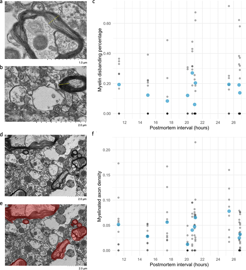 Figure 5. Quantification of the degree of myelin disbanding and the density of myelinated axons in TEM images. a, b: Representative images of myelin disbanding in TEM images, showing examples of highly disbanded (a) and non-disbanded (b) myelin. c: Scatter plot showing the percentage of myelin disbanding and the PMI. Blue points indicate the mean myelin disbanding for each sample; gray points indicate measurements from each individual image. d, e: A representative image with a particularly high density of myelinated axons (d) and the quantification of myelinated axon density in this image (e), i.e. the sum of areas containing myelinated axons (red) divided by the total area. f: Scatter plot showing the myelinated axon density and the PMI. Blue points indicate the mean myelinated axon density for each sample; gray points indicate measurements from each individual image. All points in scatter plots are partially transparent to account for overplotting. Scale bars: 2 μm. Volume electron microscopy To further characterize synaptic preservation, we conducted ssTEM on two samples with PMIs of 26.5 and 27 h. We focused the imaging on cortical layers II/III, which have been found to have a relatively moderate to high synaptic density (Anton-Sanchez et al., 2014). Qualitative analysis of the resulting image stacks revealed that all 18 synapses that met our criteria for tracing could be consistently traced across adjacent sections (Figure 6). To quantify synaptic dimensions, we approximated synaptic cleft volumes by measuring cleft length and width in each section and multiplying this area by the section thickness. The mean synaptic cleft volume was 1.731 × 10-3 μm3, with a range of 4.01 × 10-3 μm3 to 3.609 × 10-3 μm3, and a standard error of the mean of 7.16 × 10-4 μm3. This substantial variability in synaptic size aligns with previous reports on the variability of synaptic size measurements (Morales et al., 2013; Santuy et al., 2018). It is important to note that our analysis excluded synapses extending beyond the image stack boundaries, with a potential bias of our sample towards smaller synapses. Our ability to trace identified synapses across multiple sections suggests that the structure of the synaptic cleft remains largely intact in these samples, despite the PMI, at least within the subset of synapses we were able to measure.