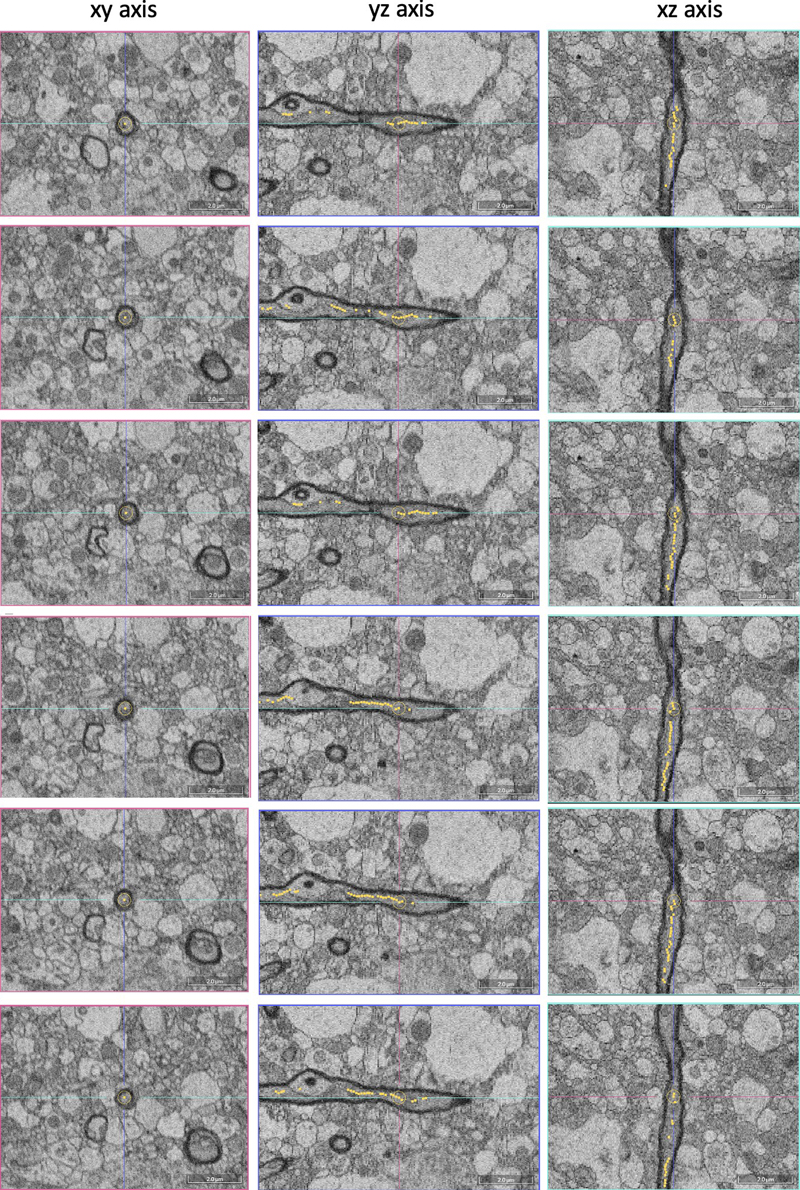 Figure 6. Representative images showing synapses that are traceable in ssTEM images. All synapses are all fully encapsulated in the set of four images. The samples are from donor numbers 36 (a, b) and 233 (c, d, e). Scale bars: 800 nm. To measure the traceability of neural structures over longer distances, we next performed SBF-SEM on two samples (samples 57 and 100, with PMIs of 25 h and 10.75 h respectively). We tested the degree to which myelinated axons could be traced across the available volumes (Figure 7). We found that all 25 myelinated axons that we attempted to trace were easily traceable (Figure 8). Overall, these findings suggest that the 3D structural integrity of myelinated axons is maintained in these immersion-fixed tissue samples, allowing for reliable tracing.