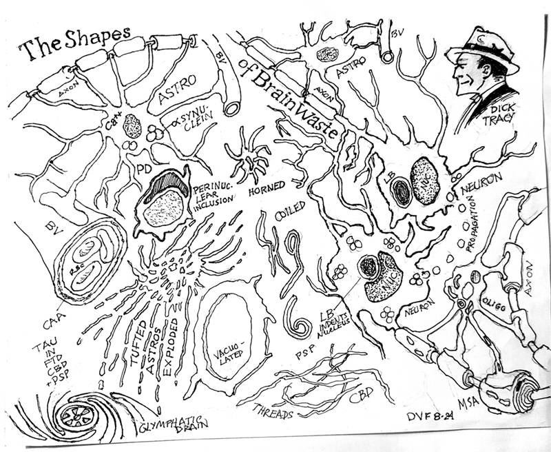“We are the corpses of cortical cells, neurons and astros and oligos. We haunt the microscopic field as ghosts, and we suggest the potential of more to be revealed right under the nose. It would not be surprising if there was significance in the shapes of cellular detritus. Michio Kaku (Quantum Supremacy, Vintage, 2023, p. 187) (2) notes that in the growing understanding of proteinomics, “function follows form” in that it is the shape of a protein molecule (rather than its chemical composition) that produces protein function. Thus, the field of “the protein folding problem”, mapping protein shape, may be the key to diseases they produce (as well as all of their effects). Let us pause for a moment and consider the strangeness of this. An analogy might be that a committee assembling a team of biomedical scientists for a specific task would choose them by a Miss America bathing suit contest, or a Mr. America muscle building contest, rather than the scientists’ proven mental abilities and accomplishments. But then, if we think again, it is not so strange when we consider that evolution, the great computational problem solver over the eons, has availed itself of every possible manner of difference in natural selection from random mutations. Granted that the component atomic structures contribute to molecular profiles, why would nature not avail itself of external shape? A key that opens a lock can be made of silver or brass or lead, and nature has never been constrained by appearances. Not only that, but experiments have found kindergarteners believe prettier teachers are smarter, and Dick Tracy’s villains had observable deformities supposedly betraying inner evil. These assumptions may be false but are popular prejudices. Taking this further, every step of dismantling the intricate structure of cellular machinery poses disposal problems of the shapes of brain garbage. When the junk luggers arrive in the brain, they need to equip themselves with tools and procedures specific for those shapes. In a city or the heavily built-up suburb in which I live, it may be expensive to tear down a house, over 20% of the cost to build one. One cannot simply blow it up (which also usually takes experts), like the Manhattan townhouse an angry divorced man prevented his wife from getting, thereby killing himself and granting her a more valuable buildable lot (Gay Talese, Bartleby and Me, Mariner Books, 2023) (3). Barrel-shaped molecular complexes called chaperones are now known to be involved in proteostasis, or the maintenance of proteins in their functioning folded state, and mutations that impair the chaperones may cause brain disorders called “chaperonopathies” (Manu Sharma, “Some brain disorders are ‘chaperonopathies’”, Science, 2024, 386 pp. 496–7) (4). Why wouldn’t they? A stereoscopic knowledge of our miniature world has progressed, from the basics of DNA and RNA structure by crystallography to the fitting shapes of antibodies. Evidence grows that the environment of this world is not a general chemical soup in which ingredients find one another by random encounters, but a highly structured factory in which siloed, sorted and meaningfully rearranged elements are assembled in corridors by tiny machines as ingenious as nature can devise. But how the polymorphic shapes of detritus are formed in neurodegeneration is yet to be explained. Actions in the microscopic world don’t just happen, as if shaken or stirred into place. Molecular-level machines do mechanical work. Nothing moves without forces exerted or tiny engines operating. Cells divide with little strings attached. Cells are amazingly mobile and agile beyond simple tropisms and osmosis in a jostling environment of Brownian weather. In our bodies the motility devices of precursor animals survive, ciliated and flagellated, or pseudopoded. On closer look, the web of mitochondria acts like a Congressional budget office doling out dollops of energy grants by unknown processes and may contribute an intelligence of its own dating from our primeval mothers. The mitotic spindle is a complex cytoskeletal machine with several moving parts and microtubules that pull apart the replicated daughter chromosomes apart toward poles they are also moving apart. Is the exploded architecture of some defunct astros the result of a tiny centrifugal push or just the dying off of central structures? Do Lewy bodies and other globular elements contract centripetally? Does a molecular membrane contain them? Are they electrostatically bounded with surface tension like raindrops and soda bubbles? How do Lewy bodies push on and indent a nuclear membrane? What propels them to displace? Are there traction and tensile pulls, molecular motors? As structures like the network of dendritic nanotubules are characterized (Dimitri Budinger and Michael T. Heneka, “Hidden networks in the brain”, Science, 2025, 390 pp. 25–26) (5), more questions arise about how they are constructed, work and are maintained. Who belong to the nanoplumbers’ union and how do they apprentice to fix nanoleaks? Do some cell remnants remain longer? Is some trash not picked up or drained so quickly as other trash? Is some never ingested and carried away by macrophages, like a garbage strike in the Bronx? Are some terminally entombed? Kept in a vase on the mantel, as it were? There are wonders, perhaps useful, to be learned from refuse for a future Malpighi, Purkinje, Cajal or Golgi to discover. Nanorobots are on their way in many branches of science, perhaps most in biomedicine. This branch of innovation is developing nanoscopic robotic tools that will be able to operate within the body to manipulate such objects as our neuropathic garbage, when we are able to “swallow the doctor.” Farther in the future is understanding of the deeper quantum level already being built in computation, the promise of which is explained by Michio Kaku in Quantum Supremacy: How The Computer Revolu