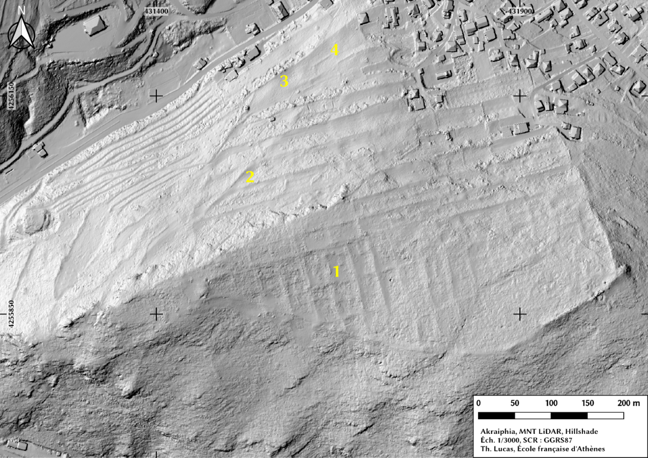 On the aerial imagery from Akraiphia, it was already possible to distinguish alternating vegetated and bare-ground areas, both on the top of the acropolis and on the northern flank of the hill of Skopia, where the remains of terraces could be easily distinguished. On the summit of the acropolis, the vegetation also forms more or less parallel lines in some places, which suggests that the ancient occupation has left a lasting mark on the terrain (Figure 1). However, the DTM derived from the LiDAR data allows us to go much further (Figure 2): the urban grid is clearly visible on the top of the acropolis, in particular a group of well legible blocks (Figure 2, no. 1), of homogeneous dimensions. Remains of buildings are clearly visible in several of these blocks.