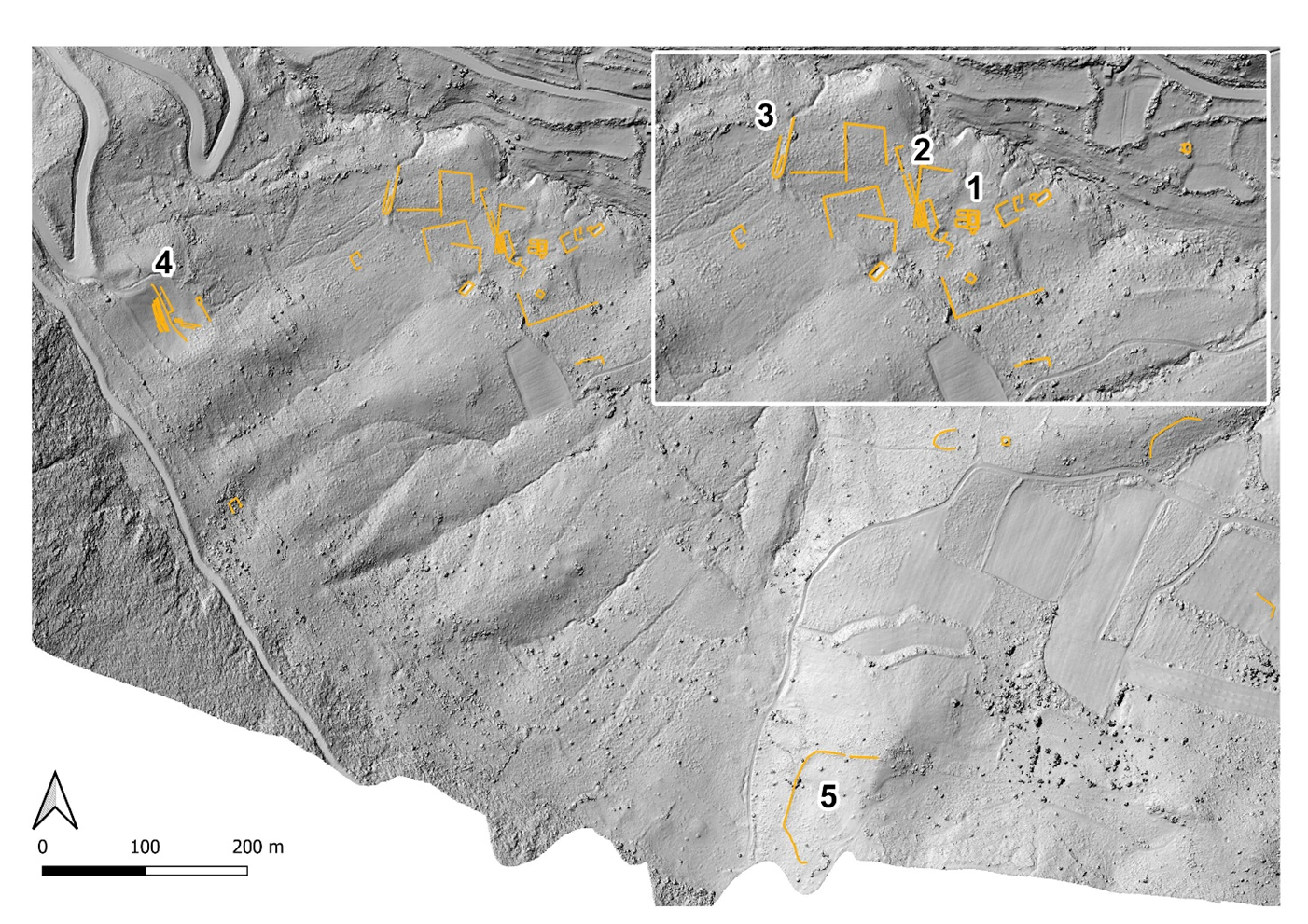 Farther south, feature 5 could be interpreted as an abandoned enclosure of unknown chronology and function. It is possible related with animal husbandry in the area. Other similar features appear at the Easternmost area of the LiDAR datasets, alongside the Permessos stream, again both chronology and functionality is unclear.