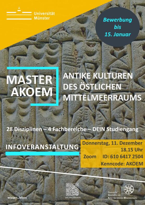 Antike Kulturen des östlichen Mittelmeerraums (AKOEM) ist ein interdisziplinärer Masterstudiengang, an dem sich fast dreißig Institute der Universität Münster beteiligen. Er richtet sich an Studierende, die sich für die Geschichte und Politik, die Sprachen und Texte, die Kulturen und Religionen sowie die materiellen und ideellen Hinterlassenschaften des Mittelmeerraums interessieren. Studierende unseres Masterstudiengangs haben mehrfach Stipendien über das Programm ProTalent eingeworben und Preise für ausgezeichnete Arbeiten erzielt. AKOEM ist auch auf Instagram aktiv. Der Studiengang wurde bereits mehrfach erfolgreich reakkreditiert; dabei wurden insbesondere das breite Lehrangebot und die hohe Qualität der Studierendenbetreuung positiv hervorgehoben.