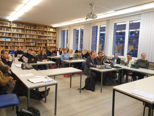 Die Durchführung im hybriden Format bedeutete, dass es sowohl möglich war, vor Ort an der Tagung teilzunehmen als auch auf Distanz per Zoom zu partizipieren. Vor Ort in Münster fand die Tagung mit viel Abstand und einem ausgearbeiteten Infektionsschutzkonzept in der Aula des Vom-Stein-Hauses statt. Mithilfe einer 360°-Konferenz-Kamera war es möglich, sowohl den Vortragenden bzw. die Vortragende als auch die Teilnehmenden im Raum digital zu sehen und zu hören. Alle Teilnehmenden über Zoom wurden im üblichen „Kachel“-Format auf einer großen Leinwand angezeigt. Auch wenn es schade war, dass aufgrund der Pandemie nur Forscherinnen und Forscher aus Deutschland und dem näheren Ausland den Weg nach Münster gefunden haben, konnten doch durch das hybride Format zahlreiche Partizipationsformen ermöglicht werden, die sicherlich auch in Zukunft mit Hinblick auf die CO2-Blianz solcher Tagungen bedenkenswert sind.