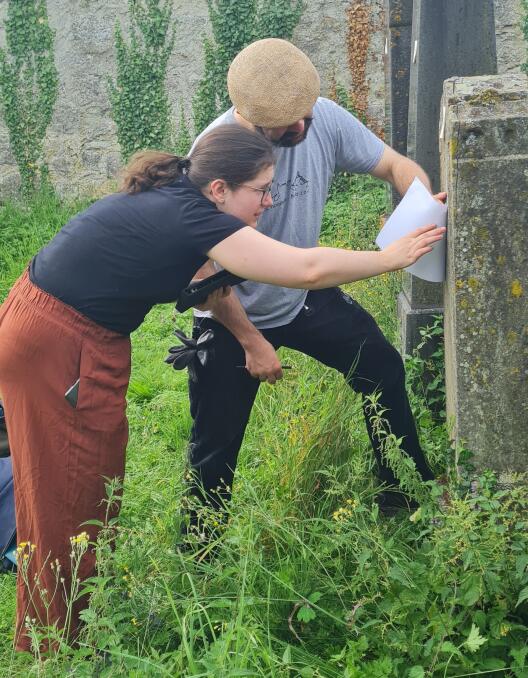 Der jüdische Friedhof in Aub ist noch nicht umfassend erschlossen. Trotz erster Aufnahmen und Inventarisierung von Grabsteinen sind die Inschriften noch nicht umfassend entziffert, transkribiert und übersetzt worden. Hier setzte die Exkursion an. Das Team musste bei Ankunft zunächst vorsichtig Efeu und Brennnesseln beseitigen, woraufhin zahlreiche zugewucherte Inschriften in der Umfassungsmauer des Friedhofs wieder zu Tage traten. Der jüdische Friedhof von Aub lag zunächst im Stadtgraben neben der östlichen Stadtmauer. Als er voll belegt war, wurde ca. 1835 schräg gegenüber ein neuer Friedhof angelegt. Als der alte Friedhof in den 1920er Jahren aufgeschüttet und eigeebnet wurde, wurden im Jahr 1923 in die Umfassungsmauer des jetzigen Friedhofs ca. 41 Grabsteine des alten Friedhofs eingelassen.