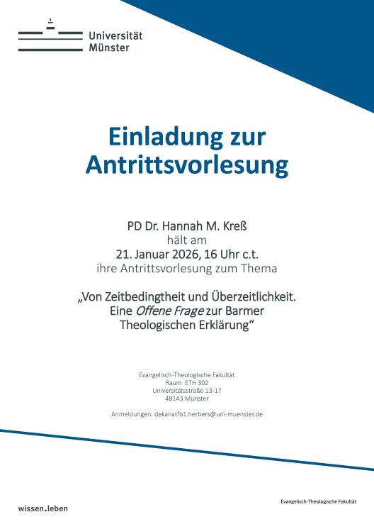 Am Mittwoch, den 26. November 2025, um 16:00 Uhr c.t., hält Professorin Dr. Simone Sinn ihre Antrittsvorlesung im Hörsaal F2 (Fürstenberghaus) mit anschließendem Empfang in der Evangelisch-Theologischen Fakultät.