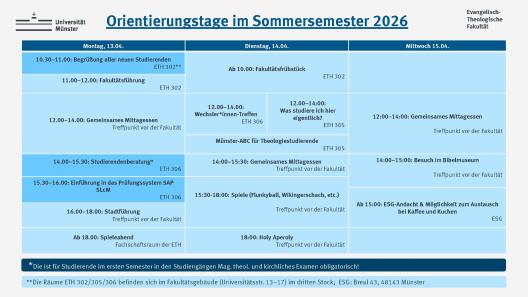 Die obligatorische Erstsemesterstudienberatung für Studierende des Mag.Theol. findet am Montag, dem 13.04.2026, 14:00-15:30 Uhr (ETH 306) im Rahmen der Orientierungswoche statt.