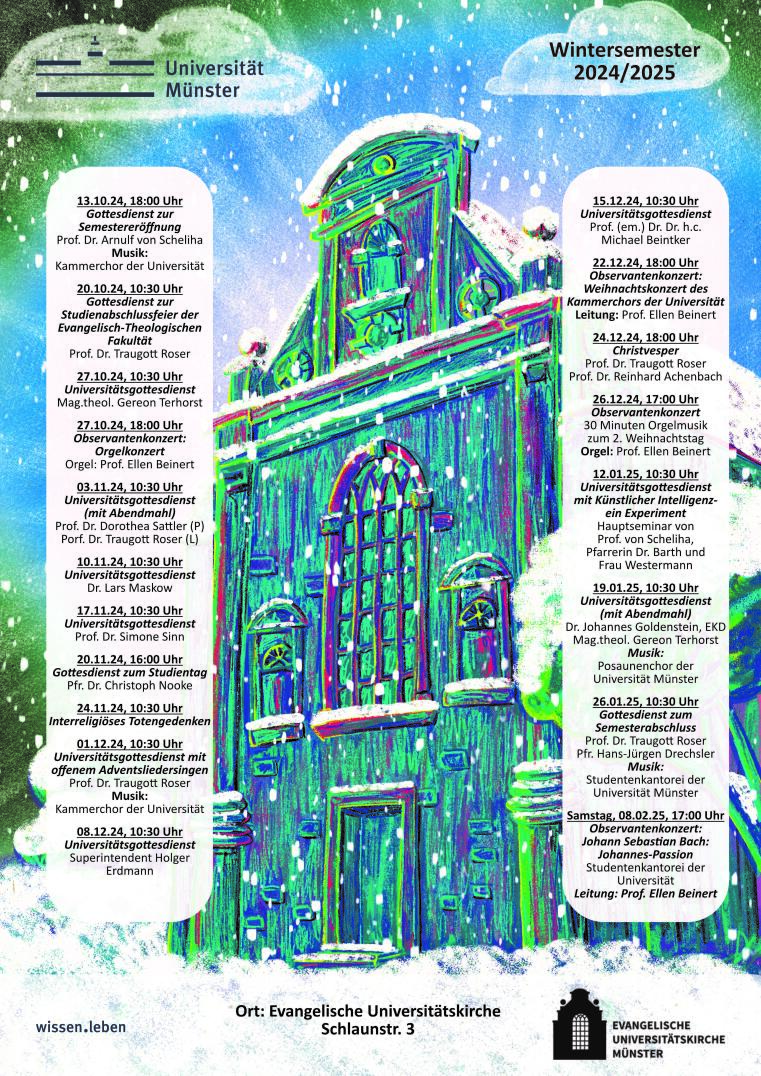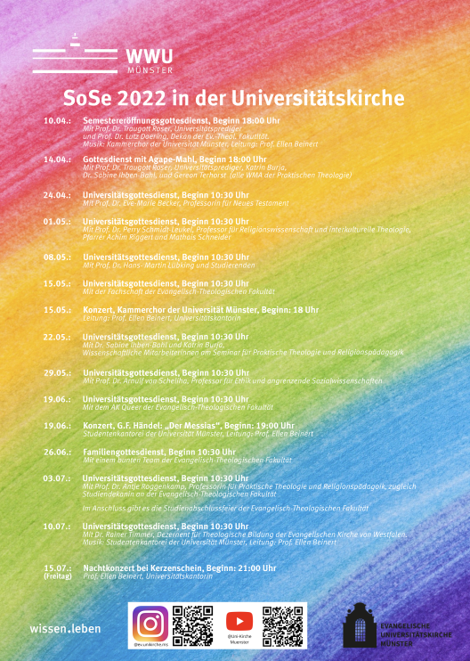 Unsere Universitätsgottesdienste finden jeden Sonntag im Semester (April-Mitte Juli/Oktober-Januar) um 10.30 Uhr statt (Ausnahmen finden Sie auf dem Programm). Weitere Infos finden Sie auch auf unserem Instagram-Kanal (@ev.unikirche.ms). Wir freuen uns auf Ihren Besuch bei uns!