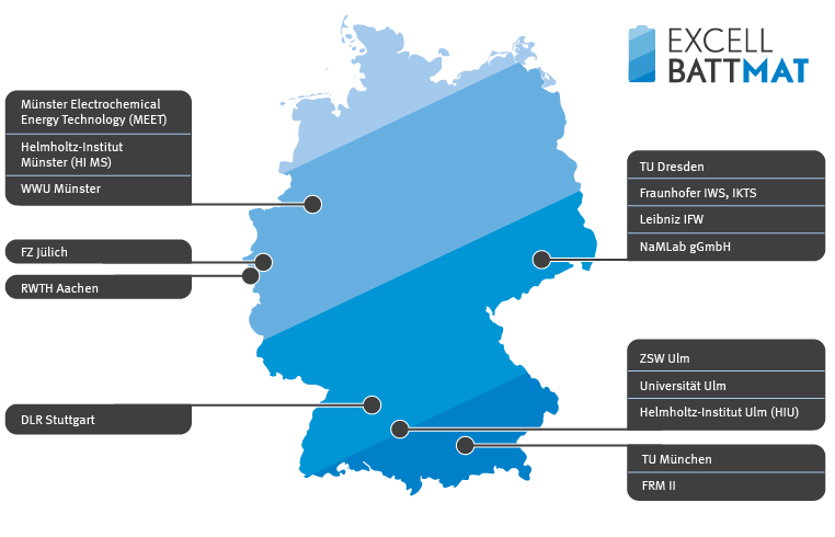 The four ExcellentBattery centers Dresden, Munich, Münster and Ulm have joined forces in the ExcellBattMat cluster. Scientific work thrives on intensive exchange, and it is precisely this exchange that characterizes the competence cluster, which brings together a wide range of expertise. The chairman of the ExcellBattMat cluster is Prof. Martin Winter, scientific director of MEET Battery Research Center at the University Münster and founding director of Helmholtz Institute Münster of Forschungszentrum Jülich.