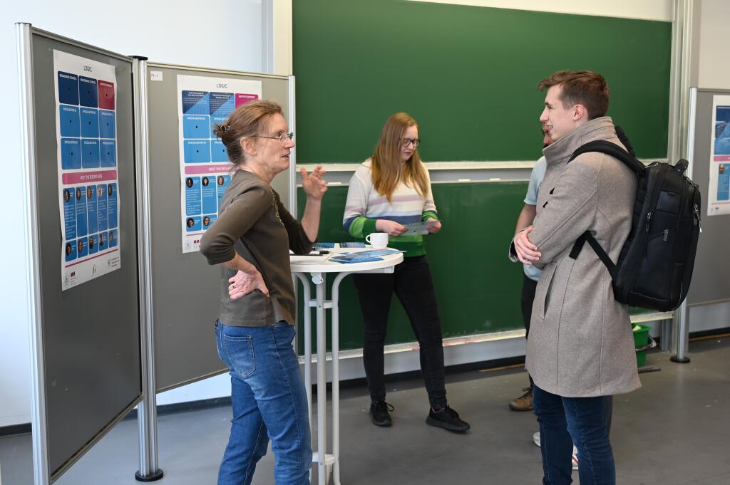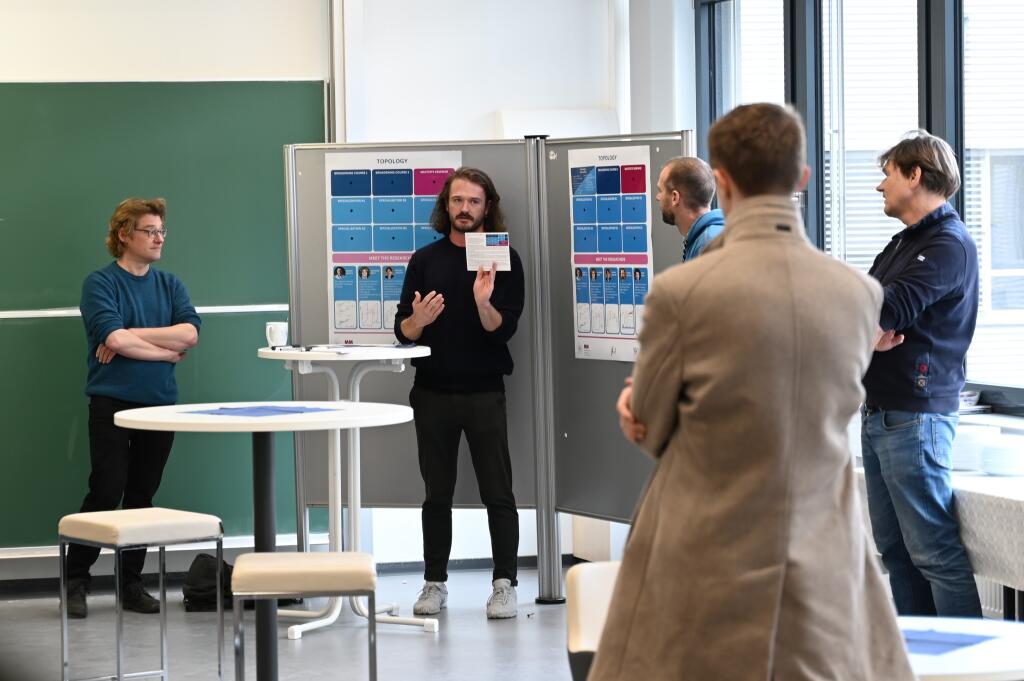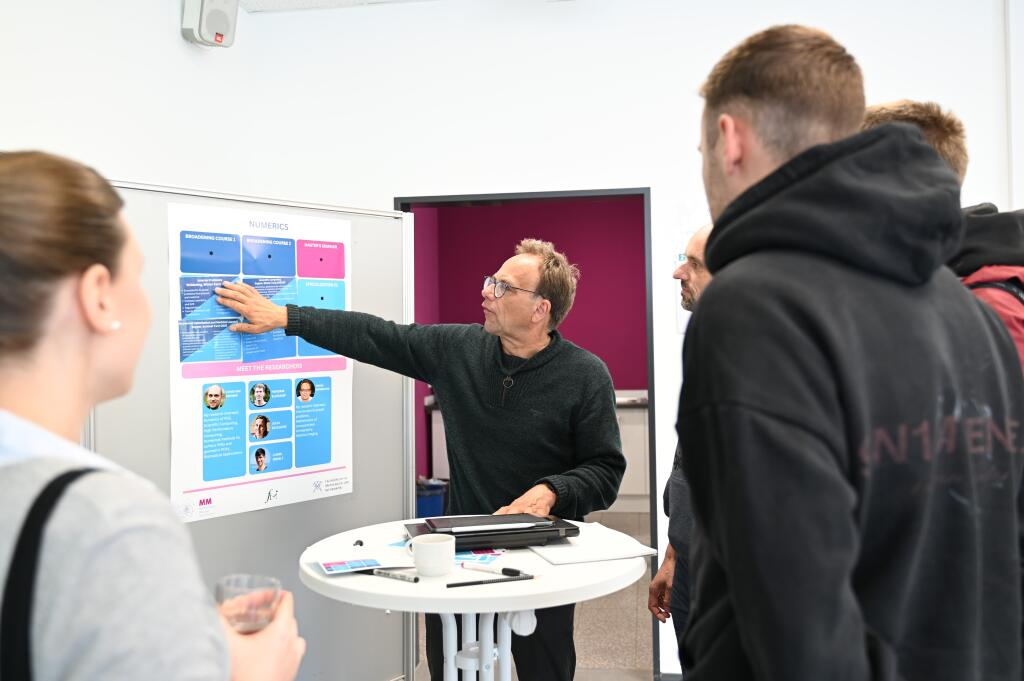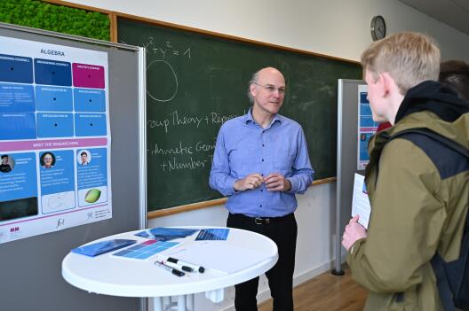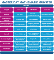 Beim Master Day Mathematik der Uni Münster bekommst du die Möglichkeit, deinen Mathematik Master in Münster konkret zu planen. Wie bei einer Messe kommst du an den 8 Ständen mit den Profs und PhDs der jeweiligen Forschungsgebiete ins persönliche Gespräch und erfährst direkt von ihnen, welche Themen du in deinem Master behandeln kannst, wie diese auf eine Masterarbeit in der Arbeitsgruppe vorbereiten können und wie es nach dem Master für dich in Münster weitergehen kann. Am Stand der Studienberatung kannst du diesen Plan formell abklären, und am Stand der Mathematics Münster Graduate School kannst du von den Doktoran*innen der Mathematik Münster erfahren, wie sich eine Promotion in Mathematik gestaltet.