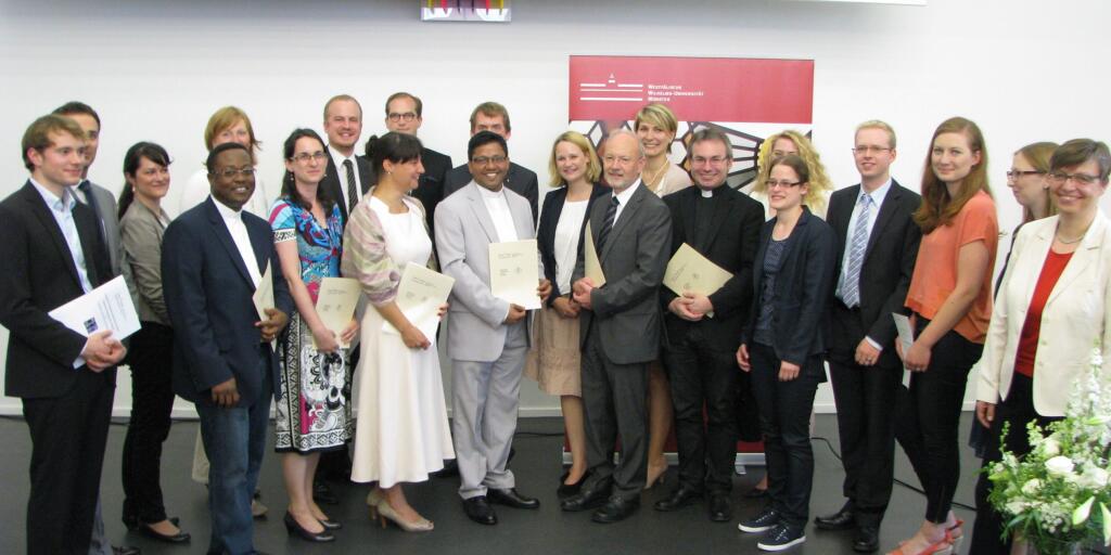 Den vom Aschendorff-Verlag ausgelobten und mit 1.000 € dotierten Dissertationspreis verlieh Dr. Bernward Kröger vom Aschendorff-Verlag Dr. Barbara Zimmermann und Dr. Maria Wernsmann zu gleichen Teilen. Wernsmann promovierte mit der Dissertation: „Vom Zusammenspiel in ökumenischen Prozessen. Ein Beitrag zur Theoriebildung: Probleme, Praxis, Perspektiven“; Zimmermann promovierte zum Thema: „Mehr als nur Wissen! Kompetenzorientierung im Bologna-Prozess. Analyse, Kritik und Handlungsoptionen aus theologiedidaktischer Perspektive“. Beide Preisträgerinnen freuten sich sehr über diese besondere Auszeichnung ihres wissenschaftlichen Arbeitens.