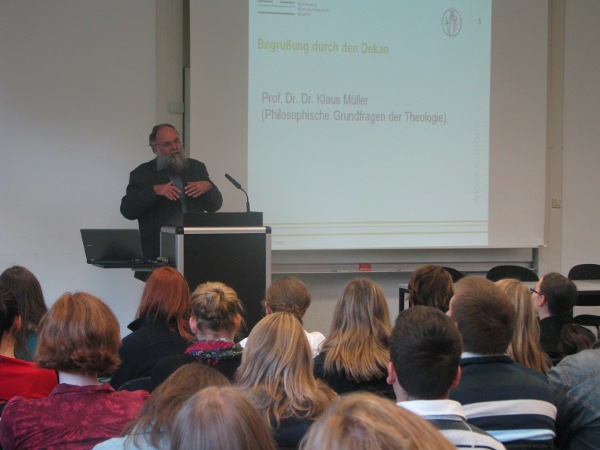 Müller verwies auf das Memorandum „Kirche 2011“, das im Februar herauskam und große Aufmerksamkeit, aber auch Widerspruch fand. „Dreiviertel der Münsteraner Professorinnen und Professoren haben es unterschrieben. Ich auch.“ Das Memorandum sei ein „Aufschrei, dass es ein Weiter-so nicht geben kann.“ Sonst, so der Dekan, komme es zu einer „Implosion in der Kirche, die vieles zerstört“. Damit das nicht geschehe, brauche die Kirche auch die „Erstis“. „Wir brauchen junge Männer und Frauen, die Herz und Hirn dafür einsetzen, dass die Schätze der Kirche nicht verloren gehen. Das sind auch Sie!“