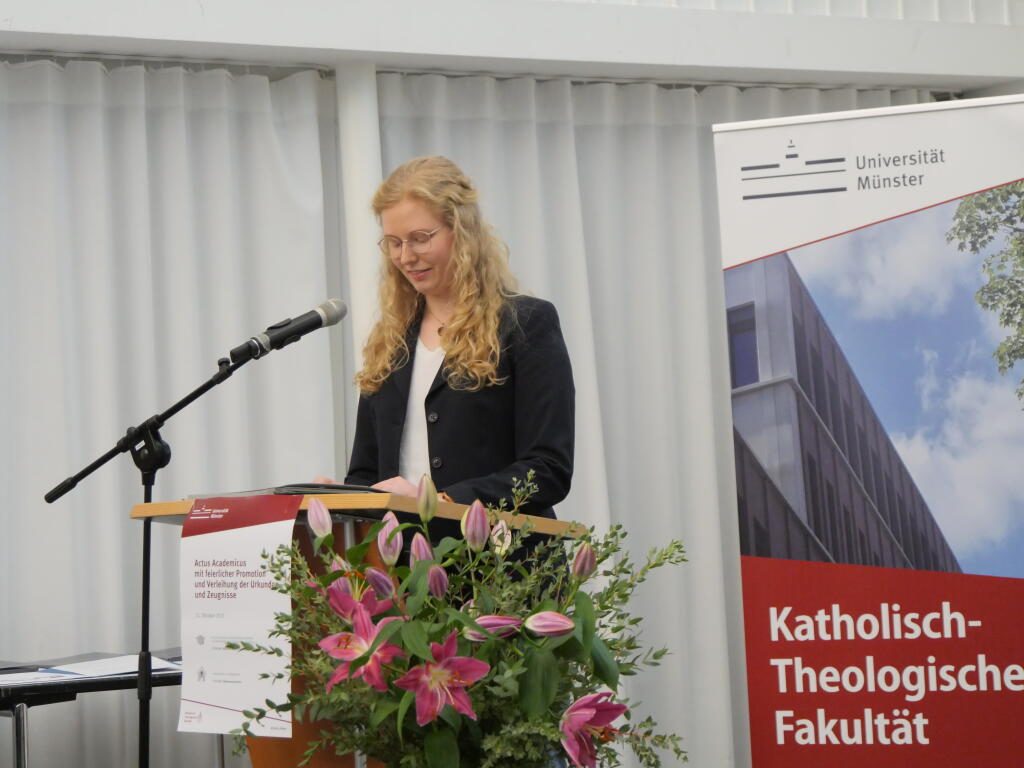 Den beim Actus Academicus traditionellen Promotionsvortrag hielt Dr. theol. Julia van der Linde zum Thema: „Zeige deine Wunde. Moraltheologische Überlegungen zu Verletzlichkeit und Macht in der (digitalen) Psychotherapie“.