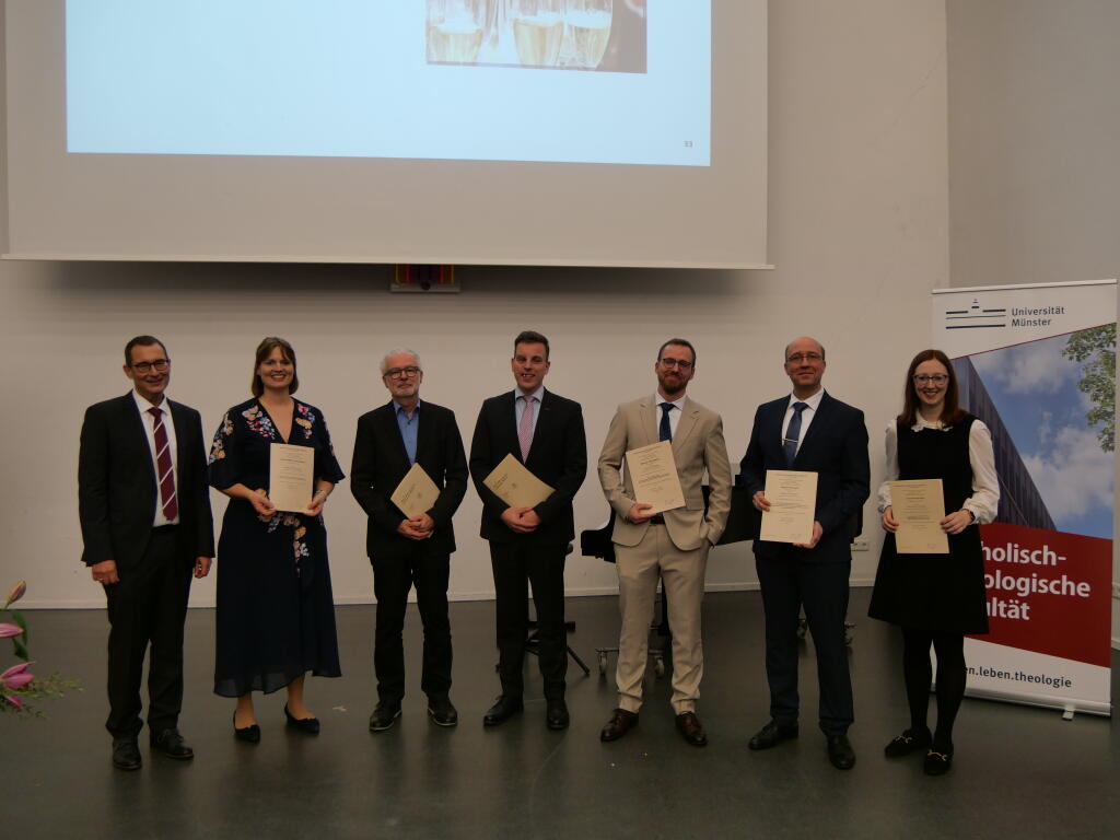 Dekan Prof. Dr. Oliver Dyma mit den sechs Neupromovierten Dr. phil. Caroline Harnack, Dr. phil. Dr. theol. Martin Spaeth, Dr. theol Maximilian Heuvelmann, Dr. theol. Michael Strothmeier, Dr. theol. Dominik Potthast und Dr. theol. Julia van der Linde (v. l. n. r.).© KTF | Dekanat