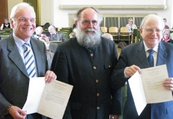 Ehrendoktorwürden für Franz-Xaver Kaufmann und Wunibald MüllerDer Soziologe Franz-Xaver Kaufmann und der Theologe und Psychotherapeut Wunibald Müller sind neue Ehrendoktoren unserer Fakultät. Am 22. Juni 2012 überreichte ihnen Dekan Klaus Müller in einem feierlichen Festakt im Münsteraner Schloss die Urkunden. Kaufmann und Müller sind die Nummern 181 und 182 in einer Reihe prominenter Ehrendoktoren seit 1833. "Mit Ihrem Namen können Sie die Reputation der Fakultät mehren", so Rektorin Ursula Nelles. "Aber diese Fakultät ist auch keine schlechte Adresse für Sie!"