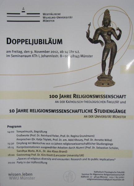 Mit indischer Tempelmusik und vielen Gästen aus unterschiedlichen Religionen wurde am 9. November 2012 das Doppeljubiläum des Seminars für Allgemeine Religionswissenschaft gefeiert: Seit 100 Jahren gibt es das Fach an unserer Fakultät, seit zehn Jahren kann man eigene religionswissenschaftliche Studiengänge an der WWU Münster belegen. "Im Moment planen wir einen eigenen Master-Studiengang", blickte Professorin Dr. Annette Wilke voraus. "Das ist eines unserer vielen Projekte."