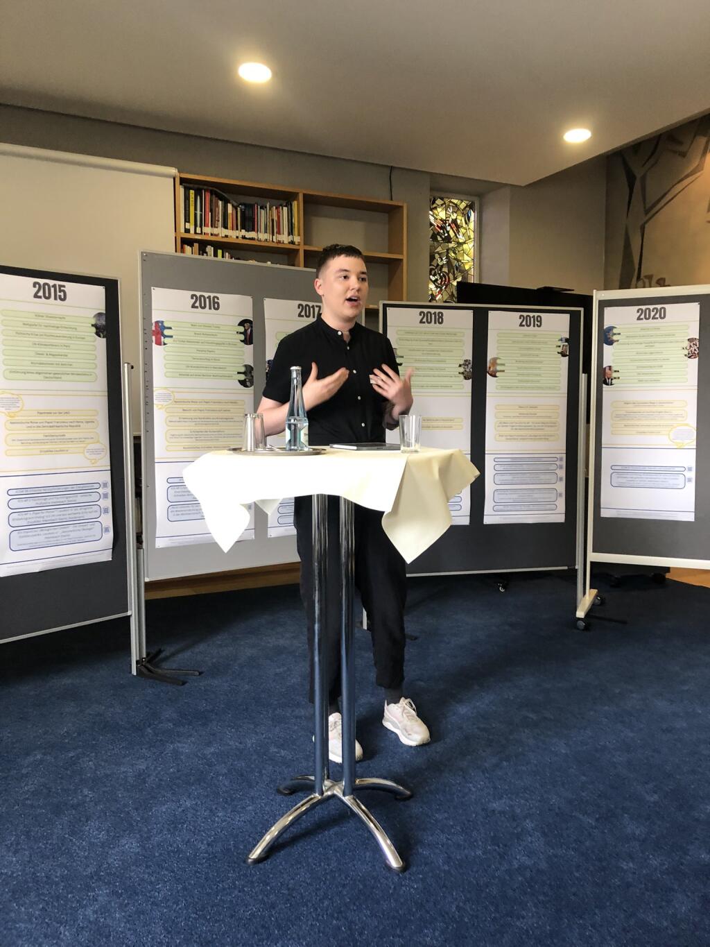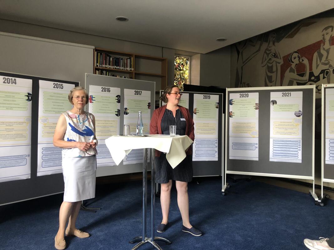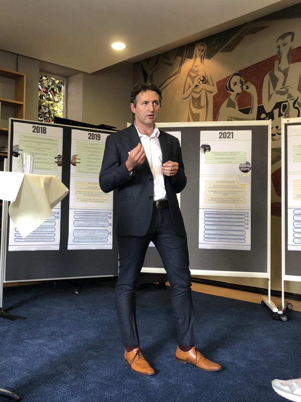 In ihrer thematischen Einführung resümierte Prof.in Marianne Heimbach-Steins welt- und kirchenpolitische Ereignisse, die das Pontifikat von Papst Franziskus bisher geprägt haben, und stellte dar, wie diese Geschehnisse und Themen mit den Arbeitsschwerpunkten des ICS korrelieren. Als Anschauungsmaterial diente dabei eine ausführliche Posterpräsentation mit einem Zeitstrahl zur Pontifikatsdekade, die perspektivische, nicht auf Vollständigkeit angelegte Erinnerungspunkte setzte.