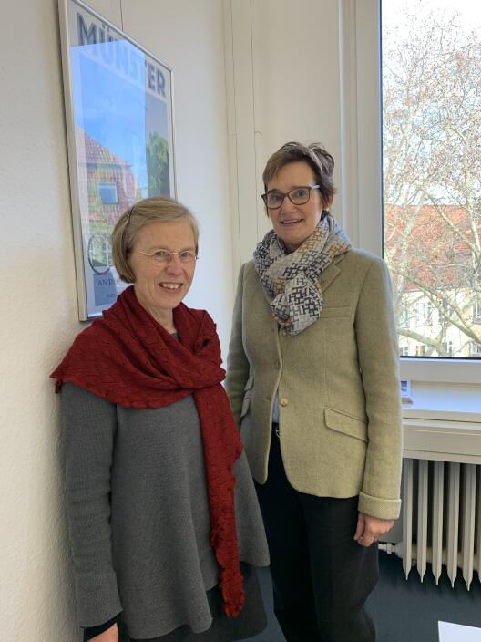 Am 18. Dezember traf die Institutsdirektorin die Münsteraner Bundestagsabgeordnete Sibylle Benning (CDU) in deren Wahlkreisbüro zu einem Meinungs- und Erfahrungsaustausch. Gesprächsthemen waren u.a. aktuelle Herausforderungen der Pflegepolitik, Zusammenhänge von Bildung und Integration, Geschlechtergleichstellung und der Diversität sowie die Notwendigkeit eines engen Austauschs zwischen universitärer ethischer Forschung und Politik zur Unterstützung von Bewusstseinsbildung und schwierigen Entscheidungsprozessen in lebensethischen Fragen wie z.B. Organspende oder Gentechnik.